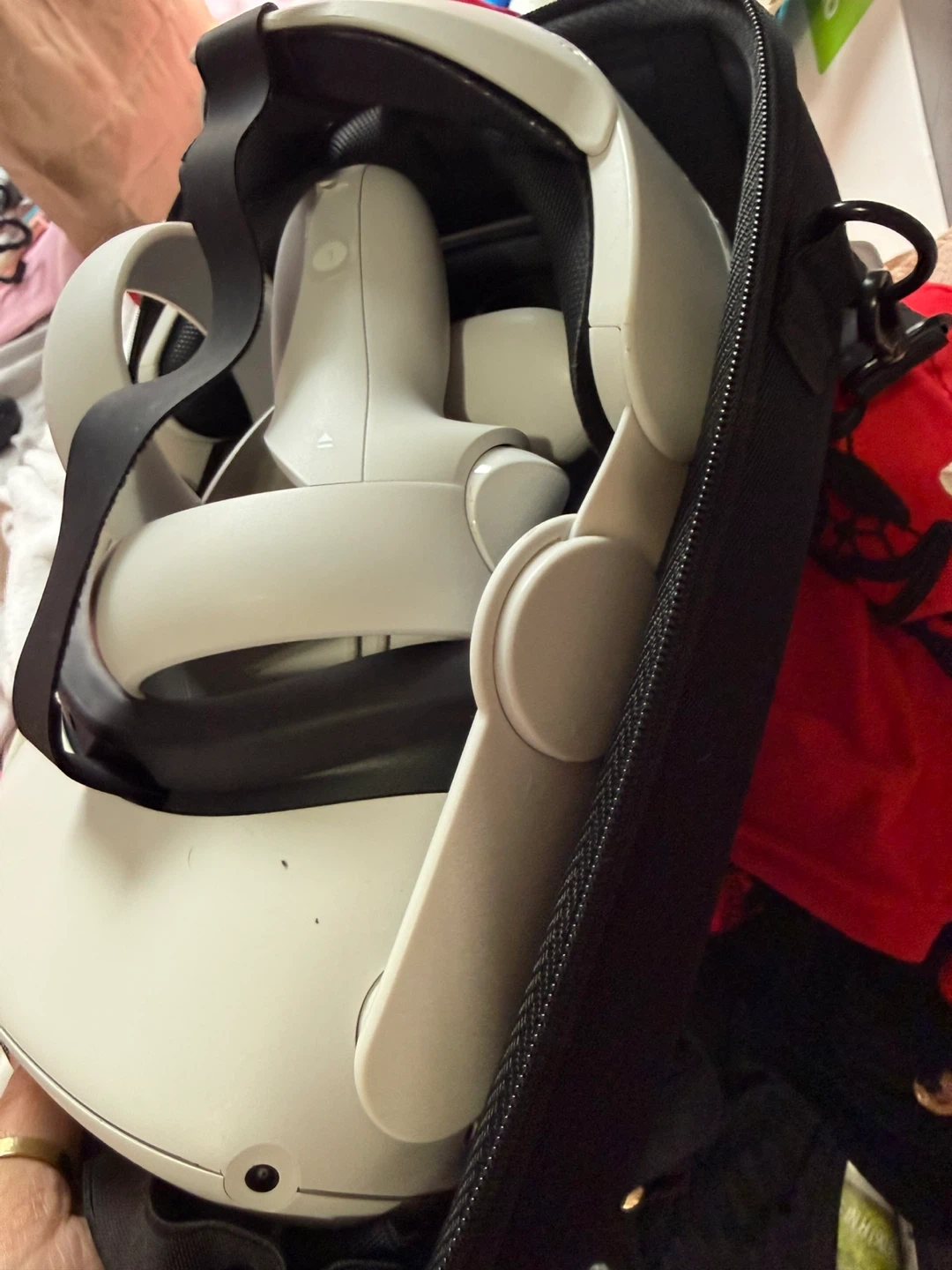 This is an Oculus Quest 2 VR headset and controllers. It comes in a protective carrying case. The headset is white.