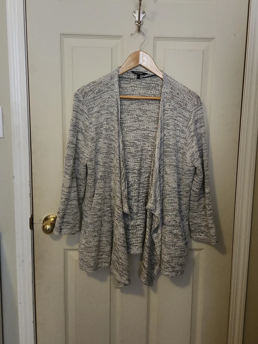 This George open front cardigan has a marled black and white knit. It features a drapey waterfall front and 3/4 length sleeves. It's a versatile layer for any outfit!