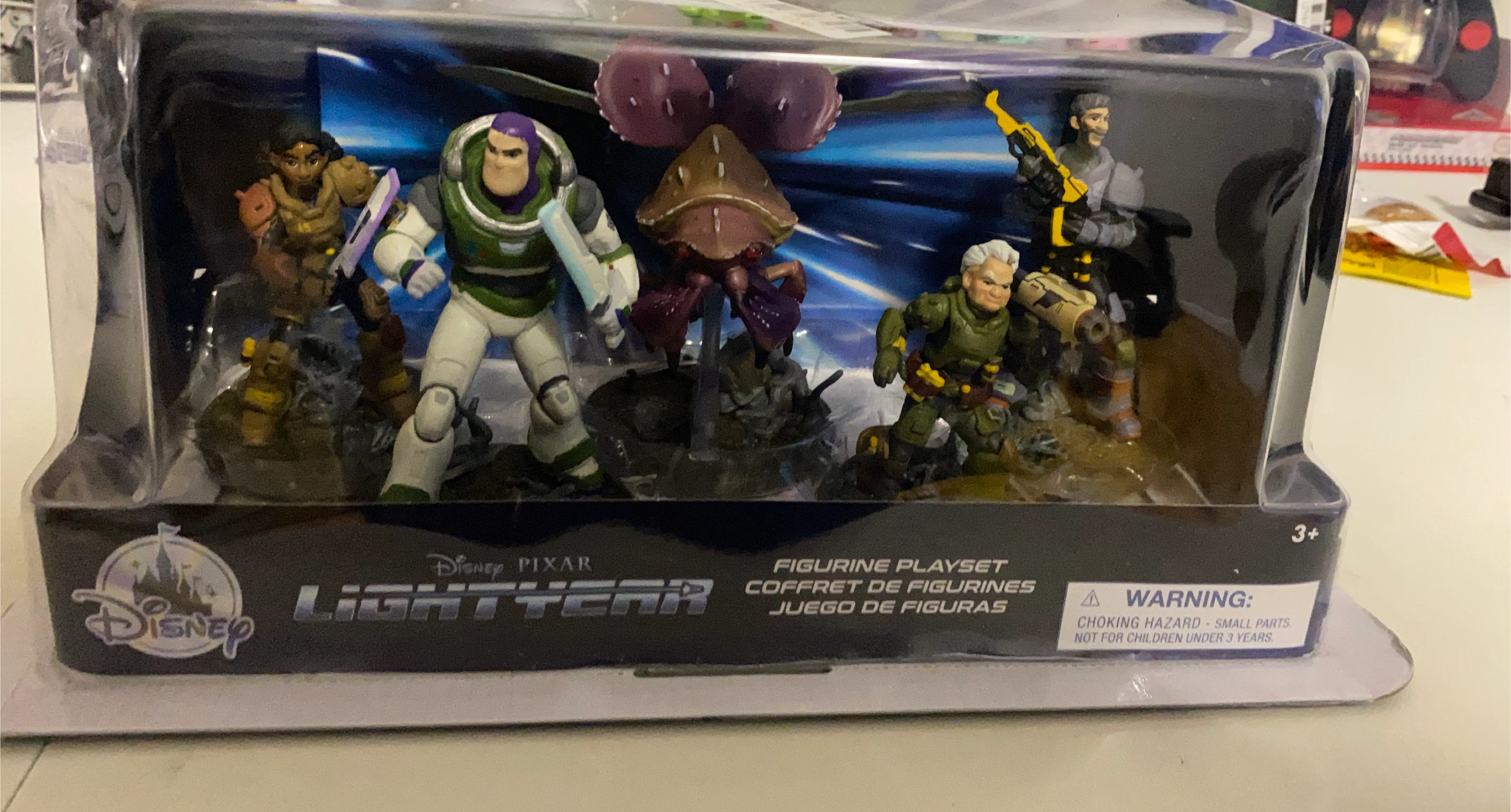 This Disney Pixar Lightyear figurine playset includes multiple characters. It's designed for ages 3 and up. Choking hazard warning applies.
