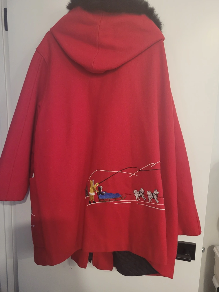 A long red wool coat with a fur-lined hood and embroidered designs on the front and back. It has two large patch pockets. The coat is fully lined with 2 way zipper.