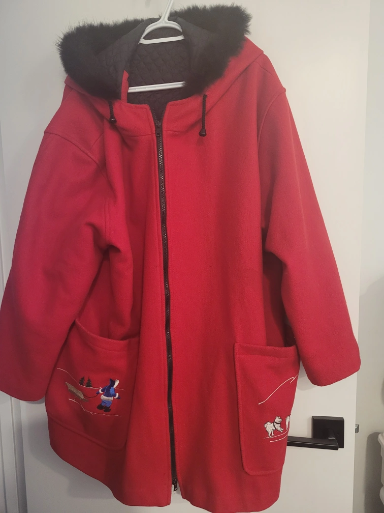 A long red wool coat with a fur-lined hood and embroidered designs on the front and back. It has two large patch pockets. The coat is fully lined with 2 way zipper.