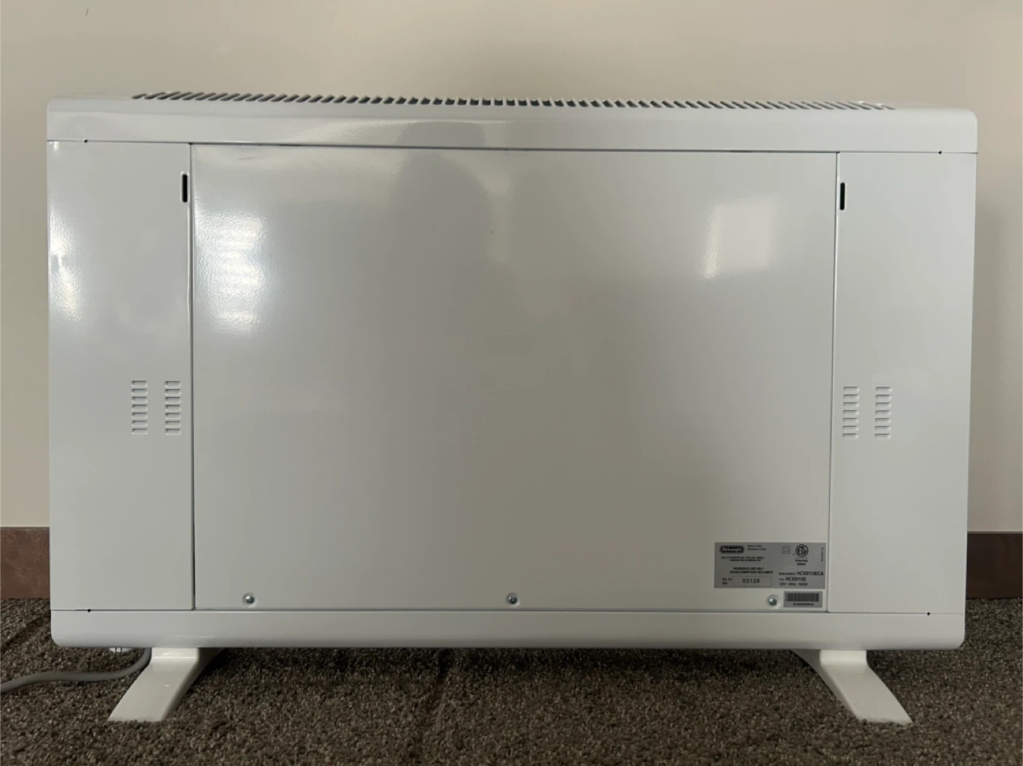 White DeLonghi convector heater with digital display. It's a portable unit with easy-to-use controls. Provides quick and efficient heating for any room.