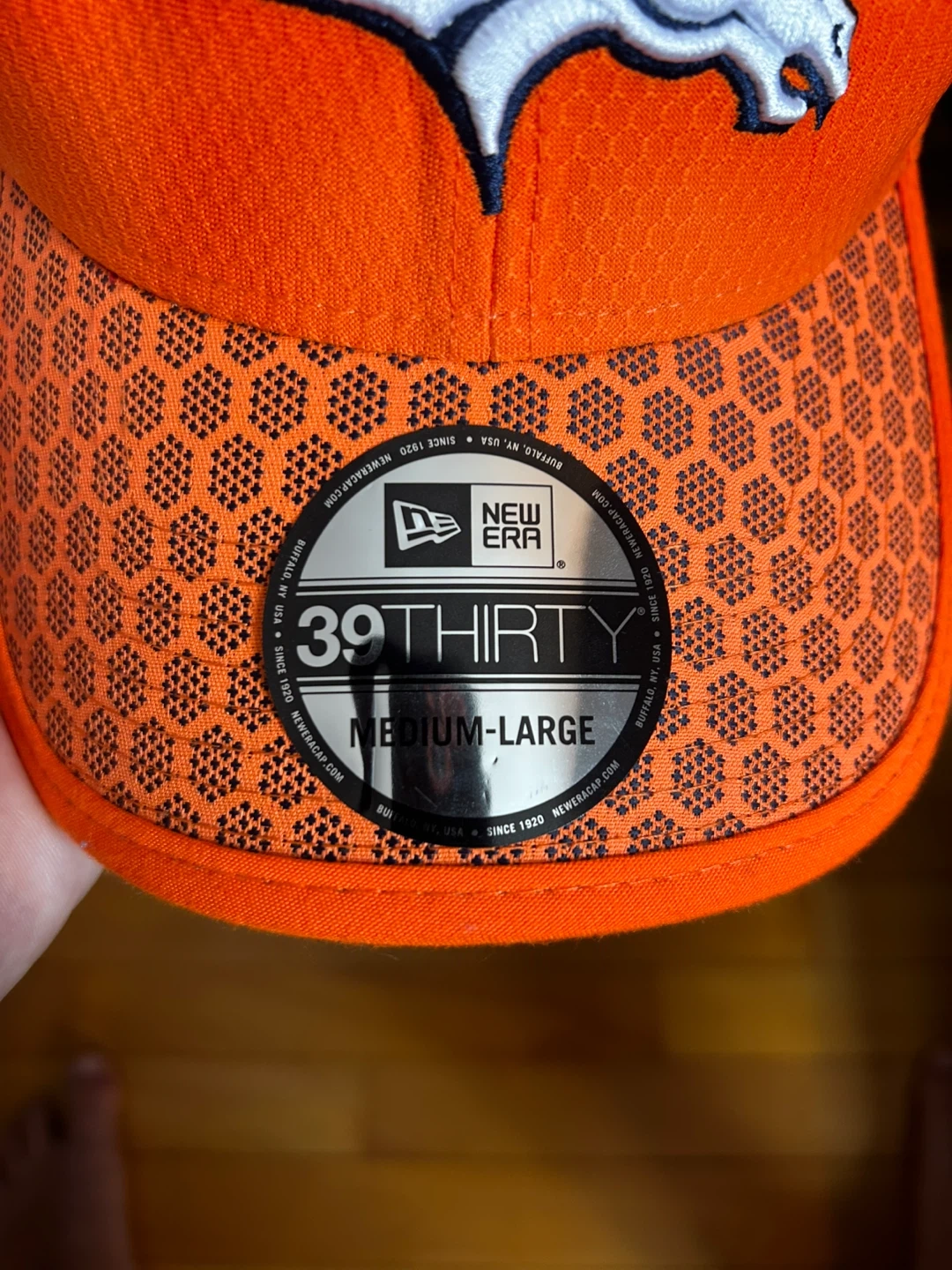 This is a New Era 39THIRTY cap featuring the Denver Broncos logo. It's size medium-large and orange. Show your team spirit with this officially licensed NFL hat!