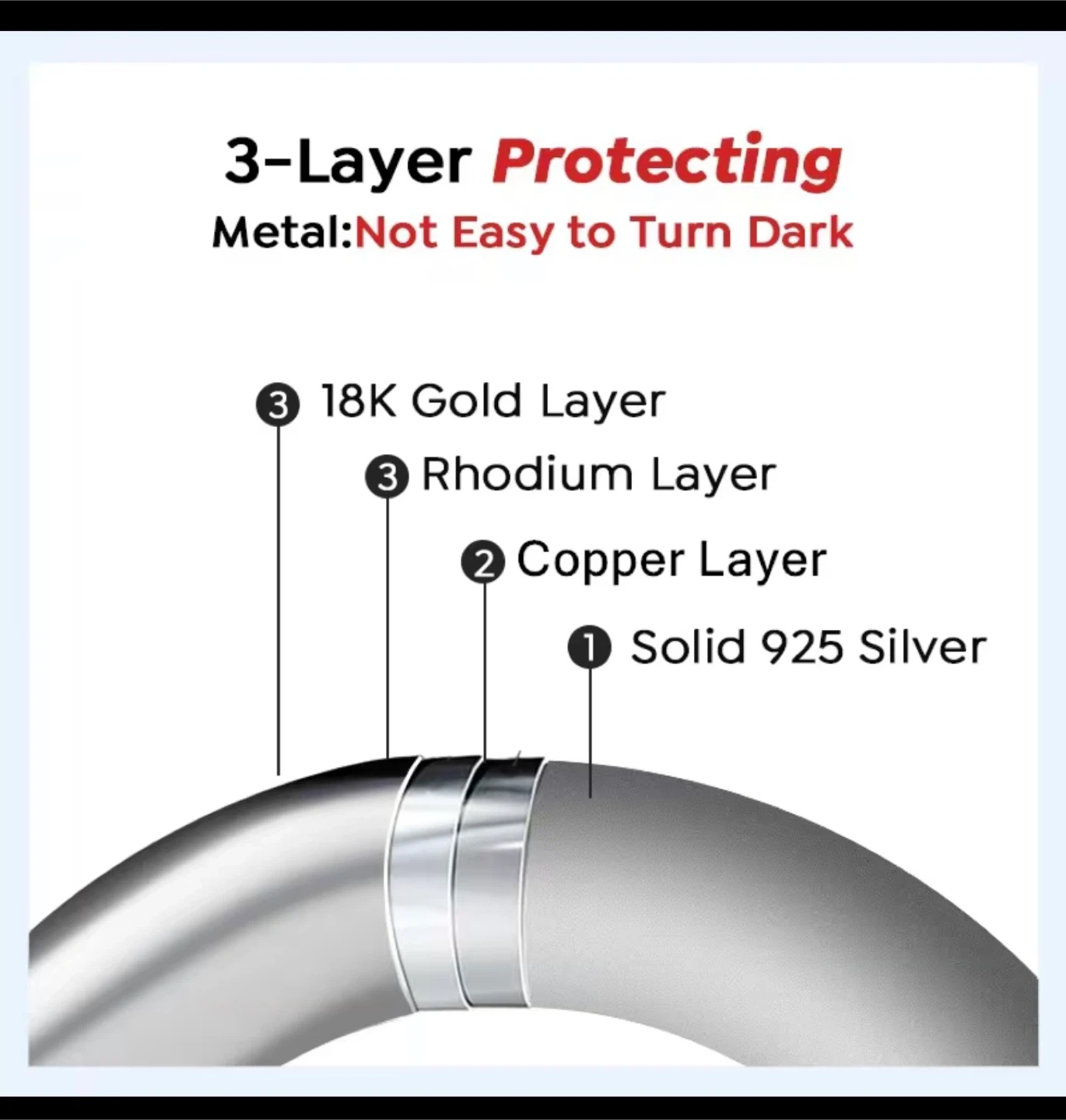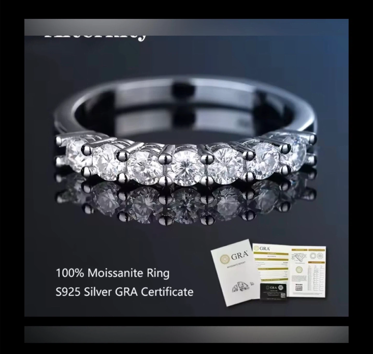 This is a 100% moissanite ring set in S925 stamp . It includes a GRA certificate for authenticity. The ring features a 3-layer plating for durability and to prevent tarnishing. It's a classic band design with multiple stones. This ring would make a great gift or personal accessory.