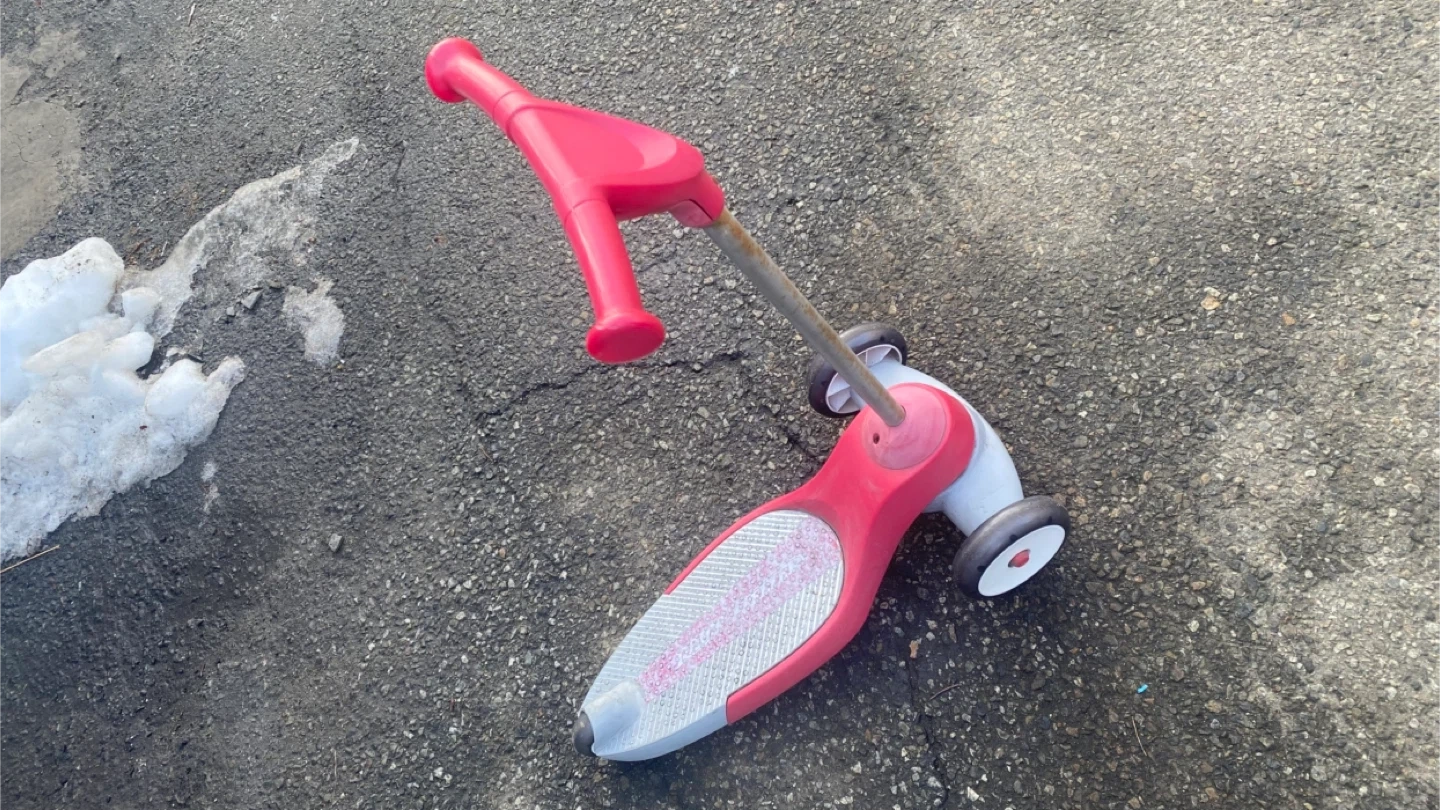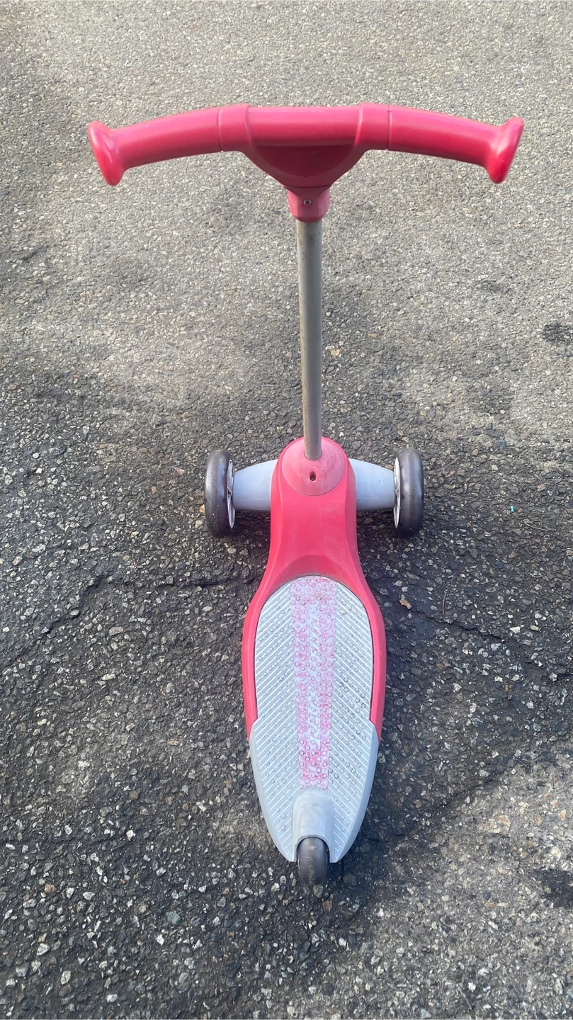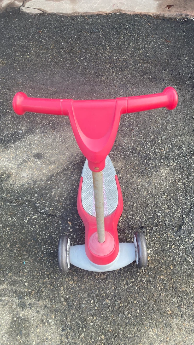 This is a red and grey Little Tikes 3-wheel scooter for kids. It's designed for stability and ease of use. The handlebars are adjustable for growing riders. Great for outdoor play!