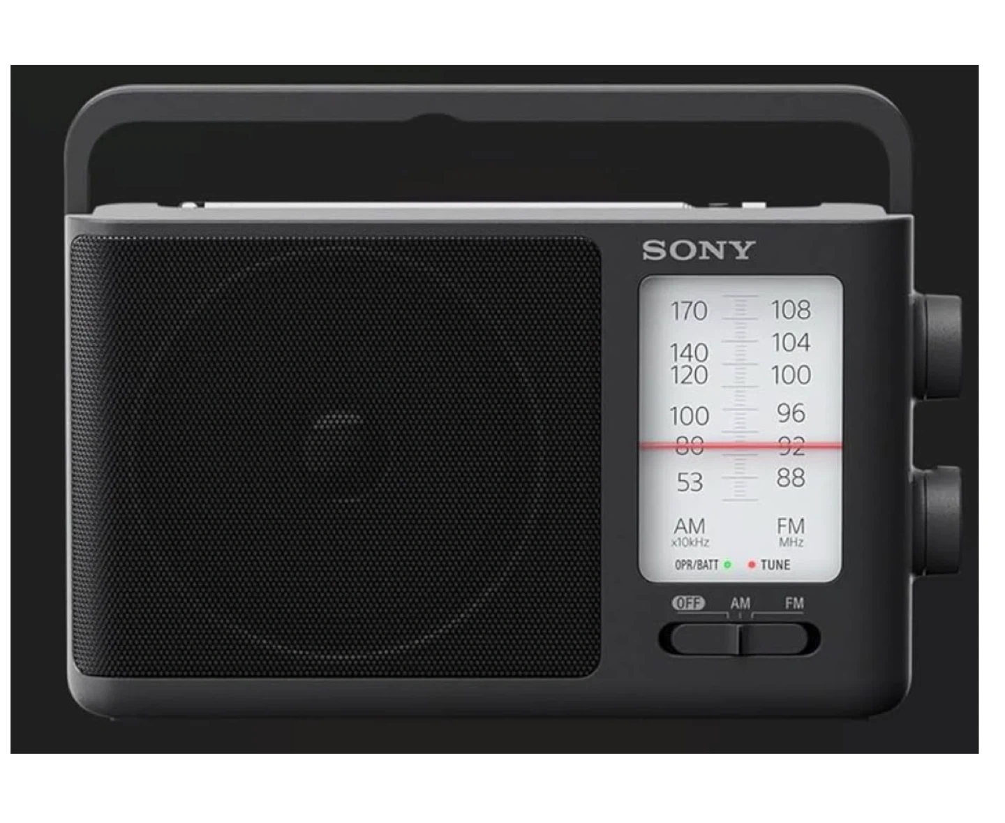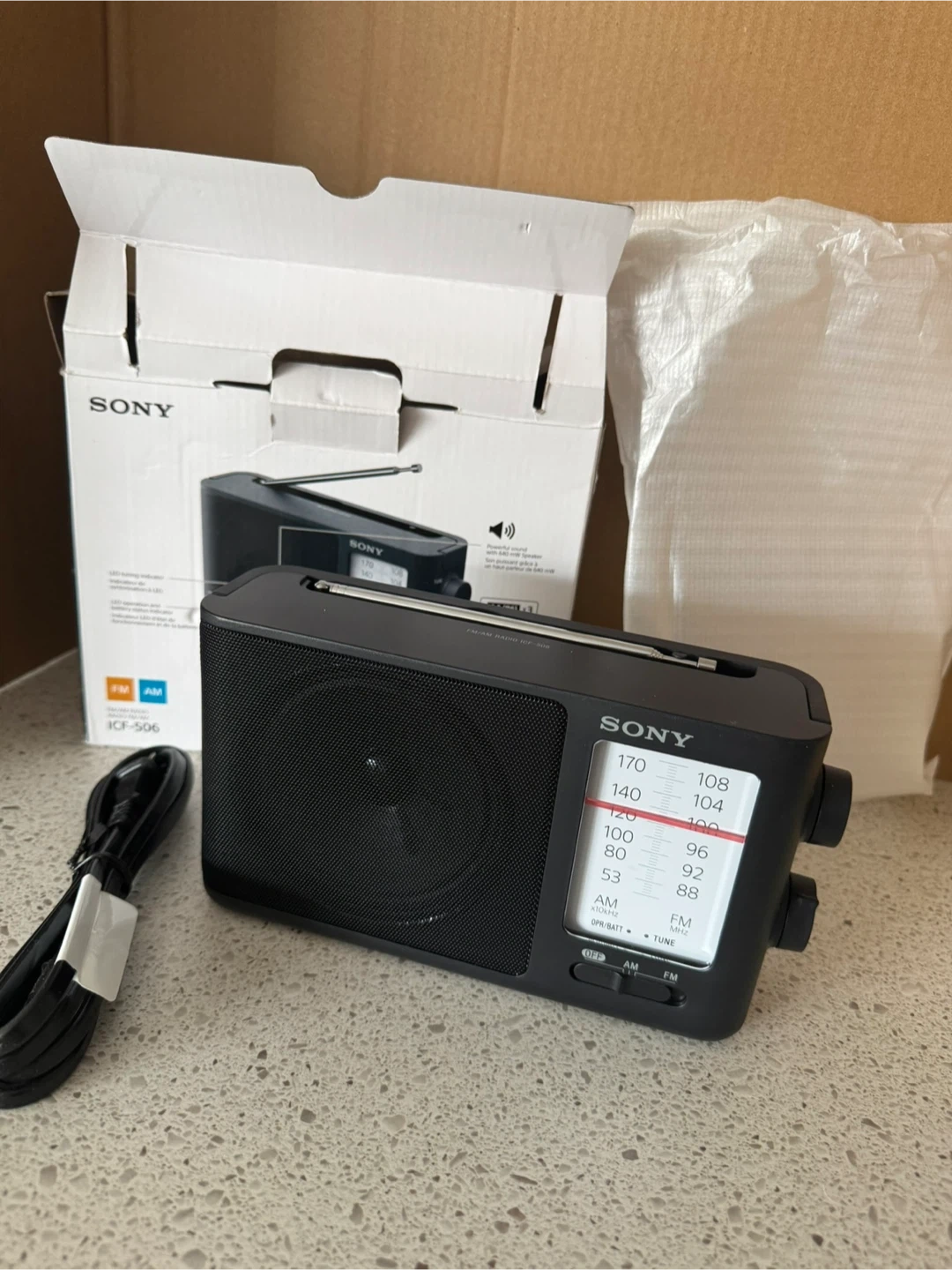 This is a black Sony ICF-506 AM/FM portable radio. It includes the original box and a power cord. The radio measures 9.06" W x 7.28" H x 2.95" D. It's great for listening to broadcasts on the go! Retro style radio plug in or battery operated for on the go listening. Good in the farm on outdoors
