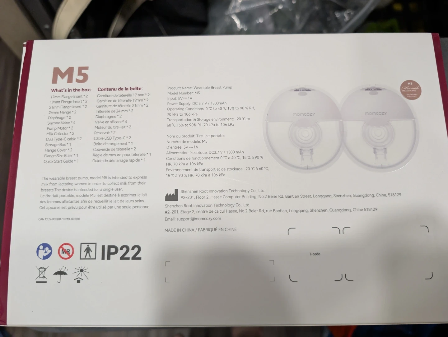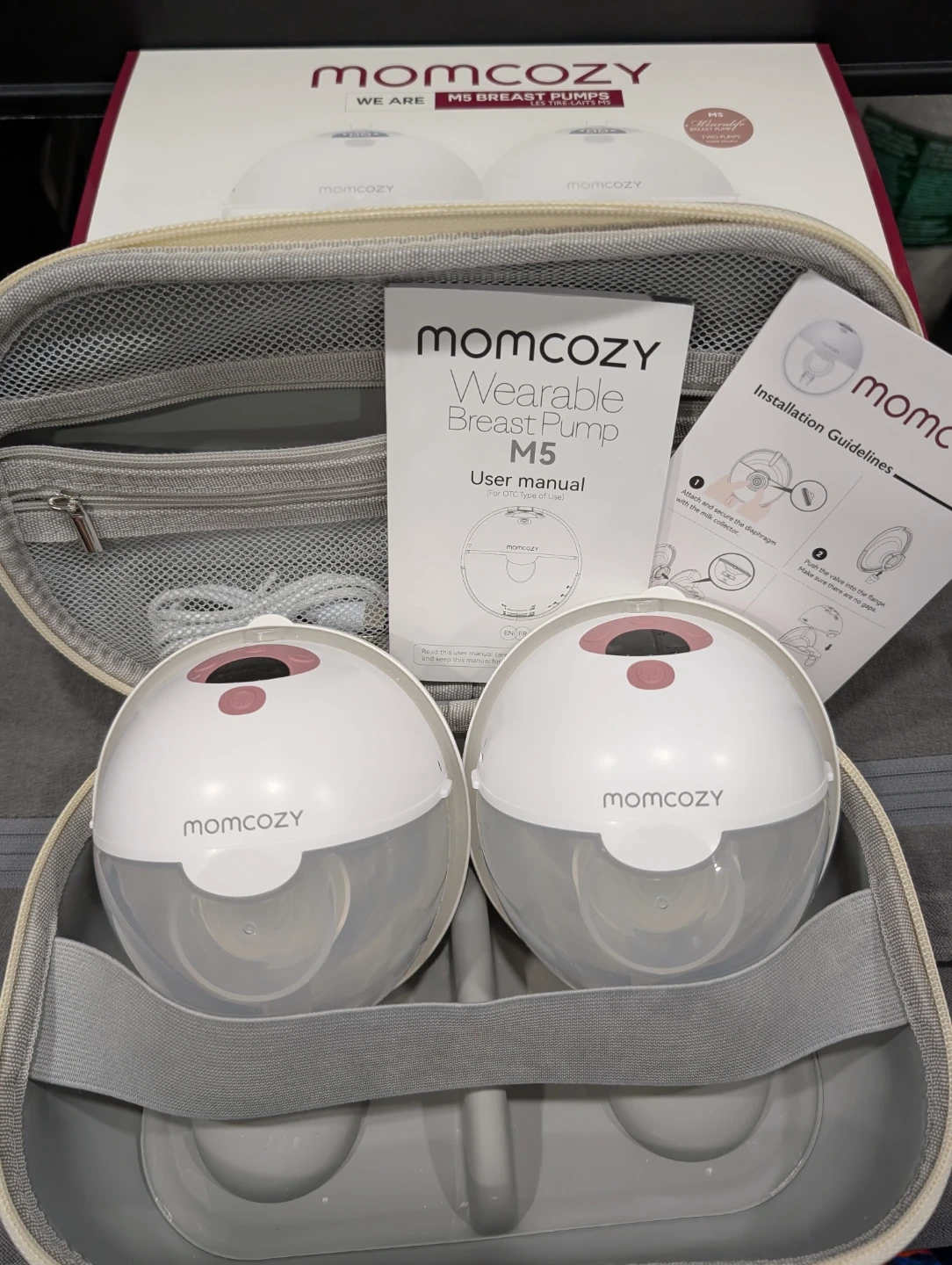 Momcozy M5 wearable breast pump with two pumps. Includes flange inserts, tubing, valve, storage box, and USB Type-C cable. It has a rechargeable battery. This pump is designed for discreet use while providing convenience for pumping on the go.