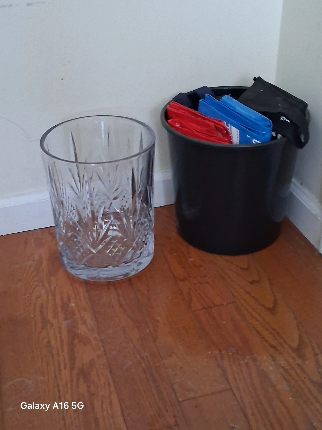 About the size of an office-desk garbage pail, this clear glass Vase/ Plant Pot with an intricate cut glass design. It's heavy in weight, glass construction is sure to bring elegance to any lit setting.