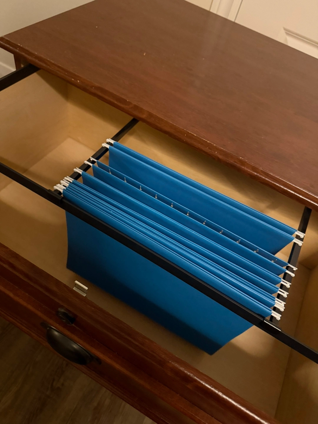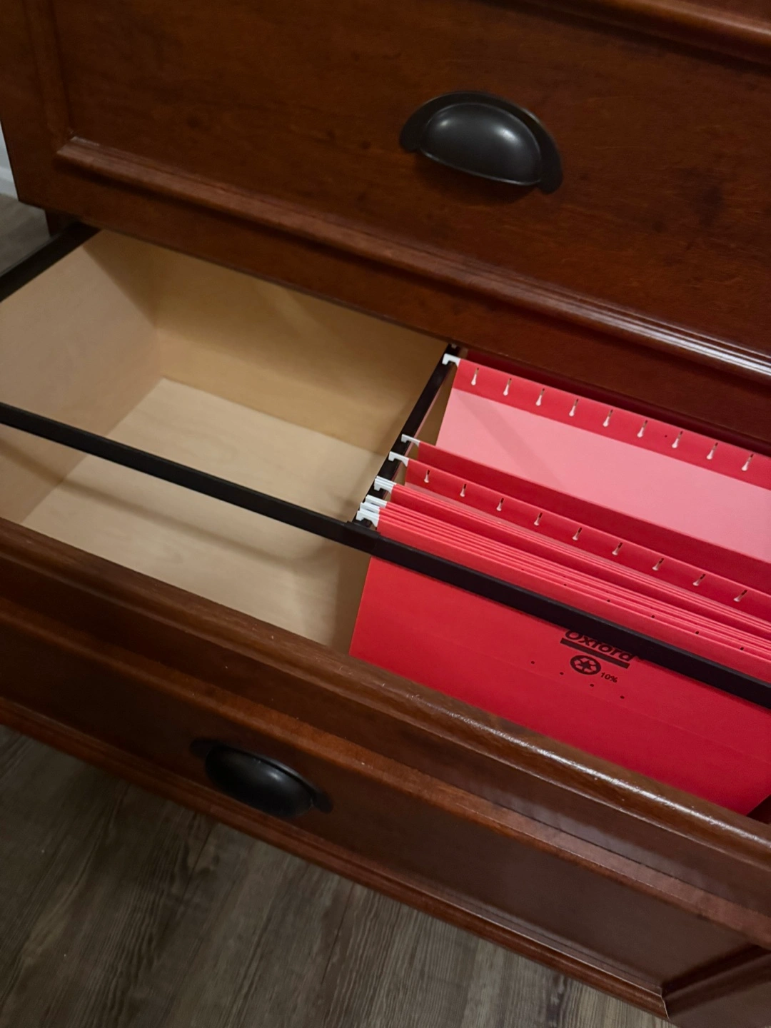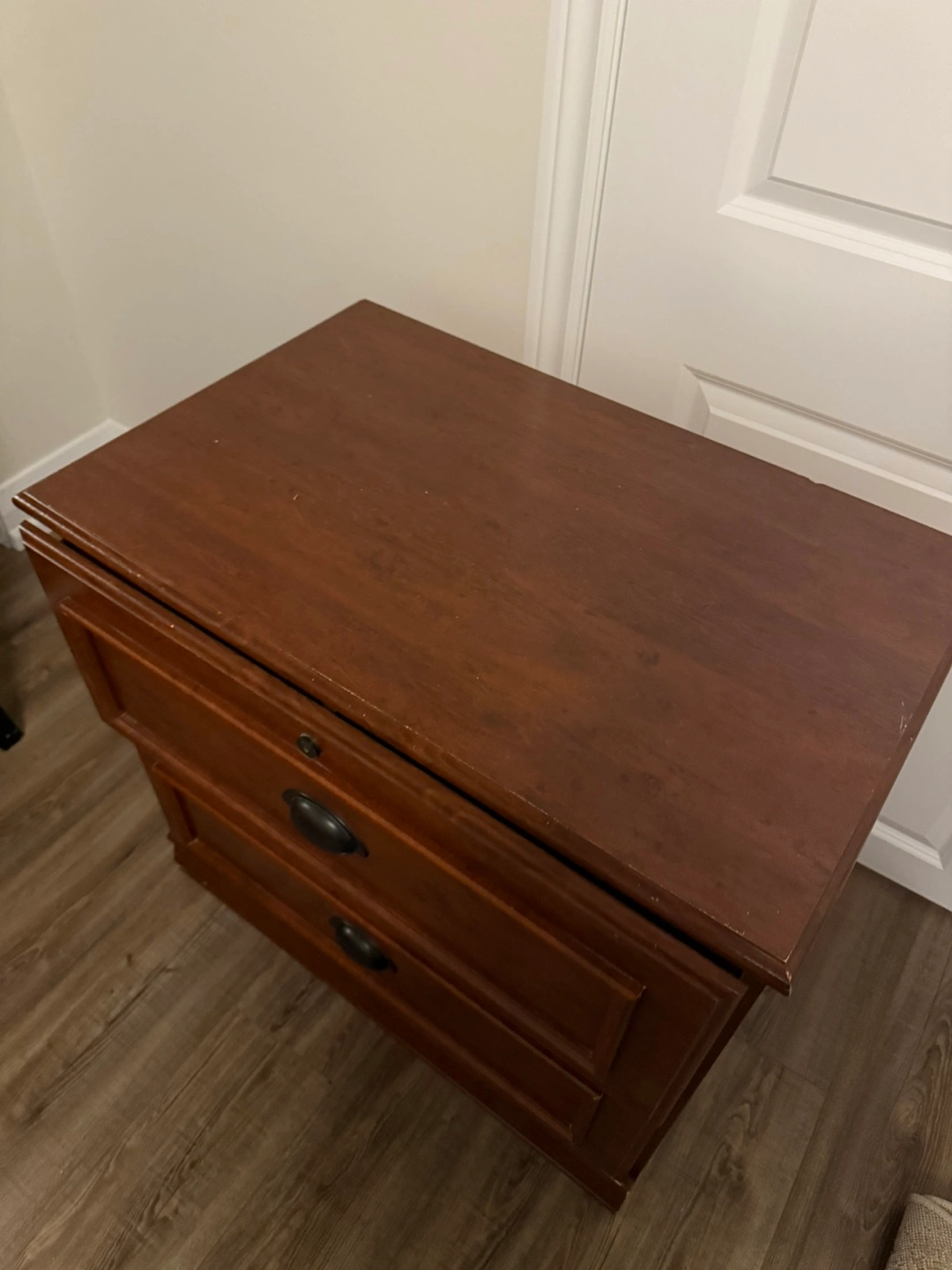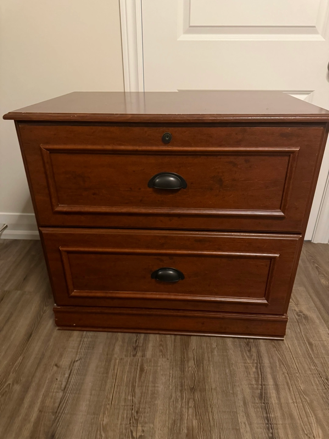 Wooden lateral file cabinet. Two drawers with metal pulls. File folders included. Great for office or home organization. Solid wood.