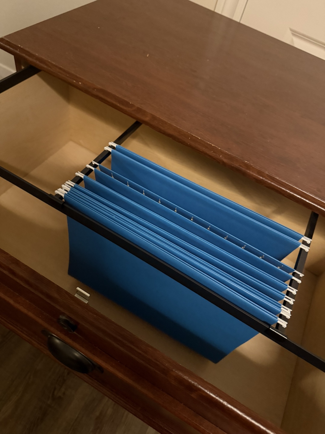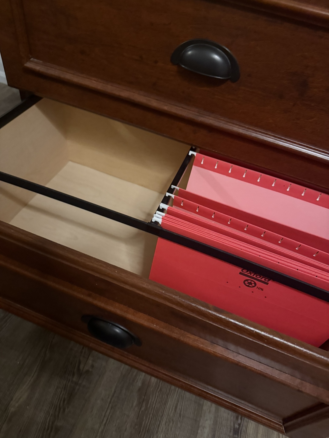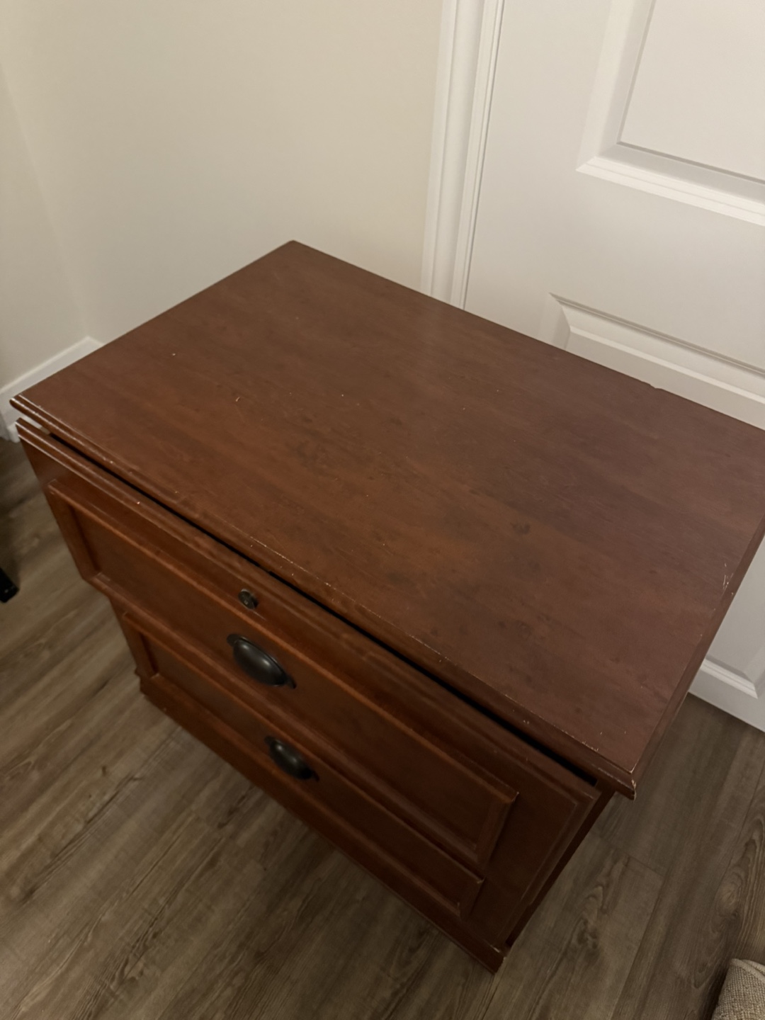 Wooden lateral file cabinet. Two drawers with metal pulls. File folders included. Great for office or home organization. Solid wood.
