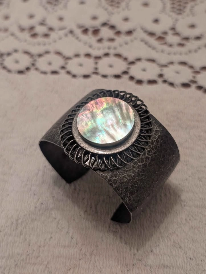 Unique cuff bracelet with a hammered metal texture and a shimmery mother of pearl inlay in the center. The inlay is surrounded by a wire-wrapped design. Great accessory to add a little something extra to your outfit.