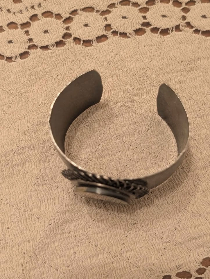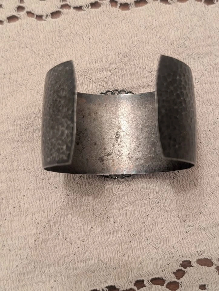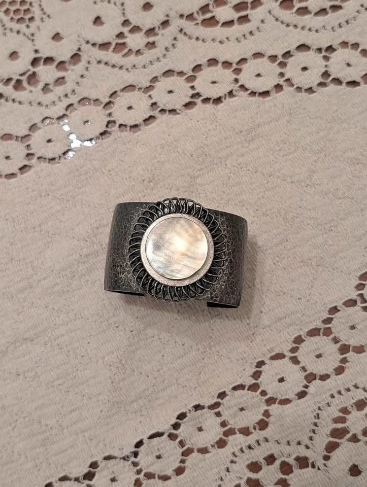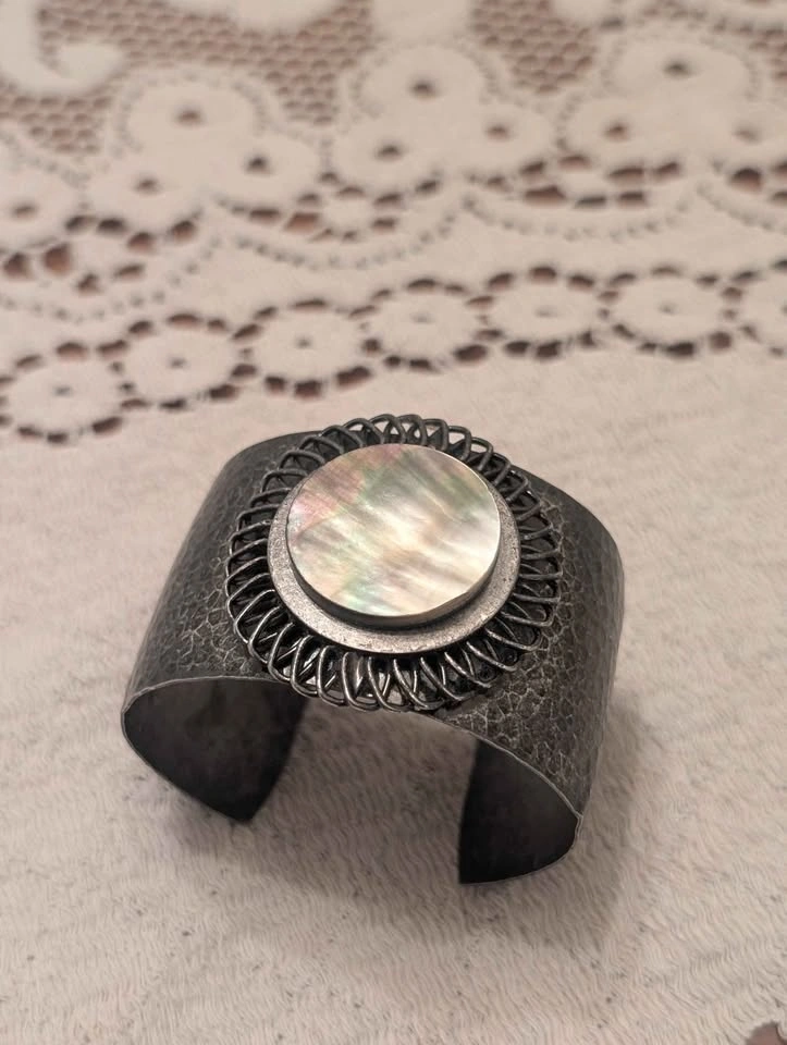 Unique cuff bracelet with a hammered metal texture and a shimmery mother of pearl inlay in the center. The inlay is surrounded by a wire-wrapped design. Great accessory to add a little something extra to your outfit.