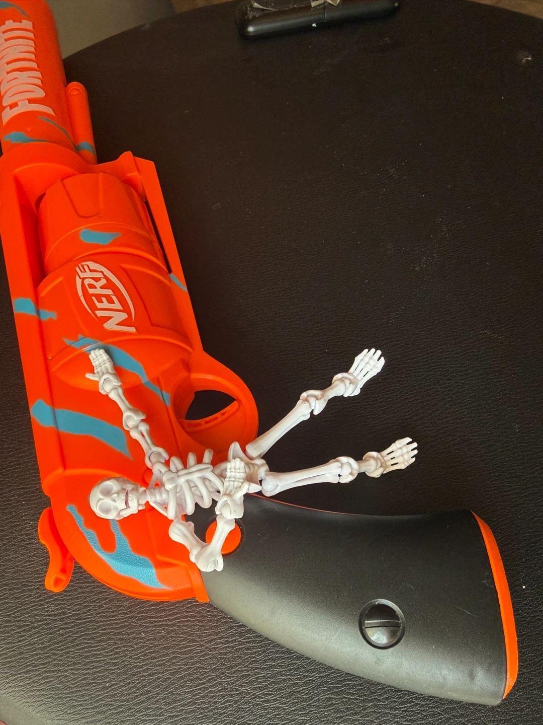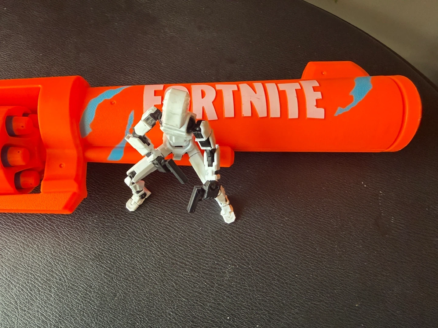 Orange and blue Nerf DG blaster. Features Fortnite branding. Perfect for Fortnite fans and Nerf wars this upcoming summer and spring!