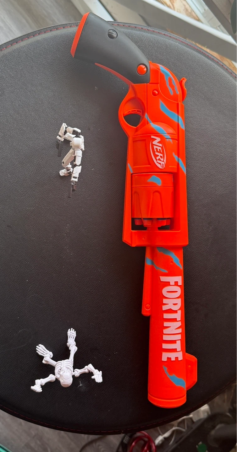 Orange and blue Nerf DG blaster. Features Fortnite branding. Perfect for Fortnite fans and Nerf wars this upcoming summer and spring!