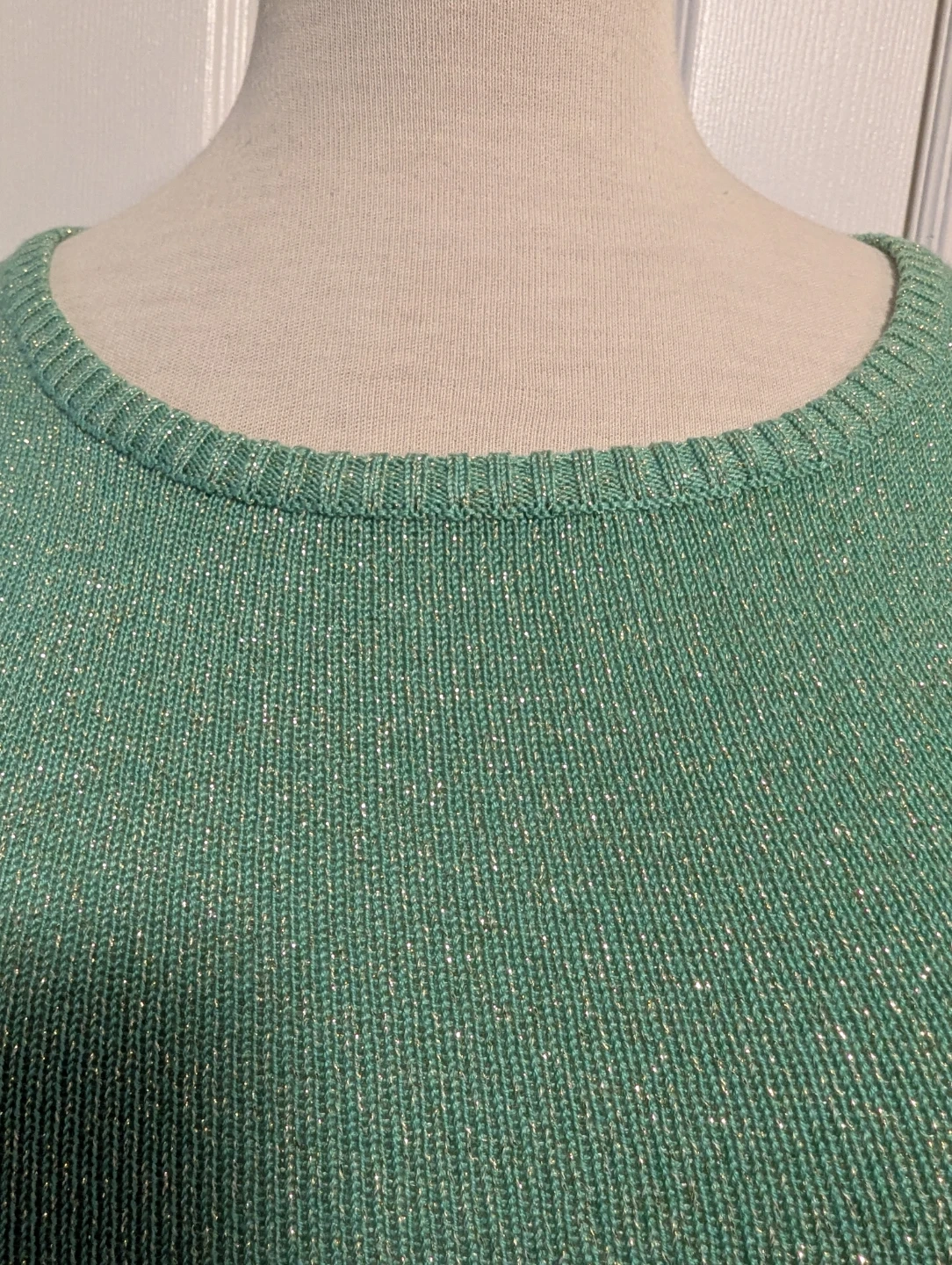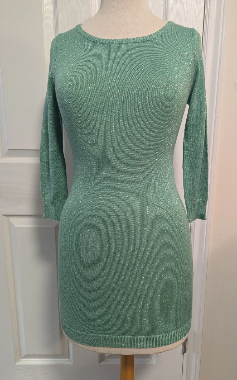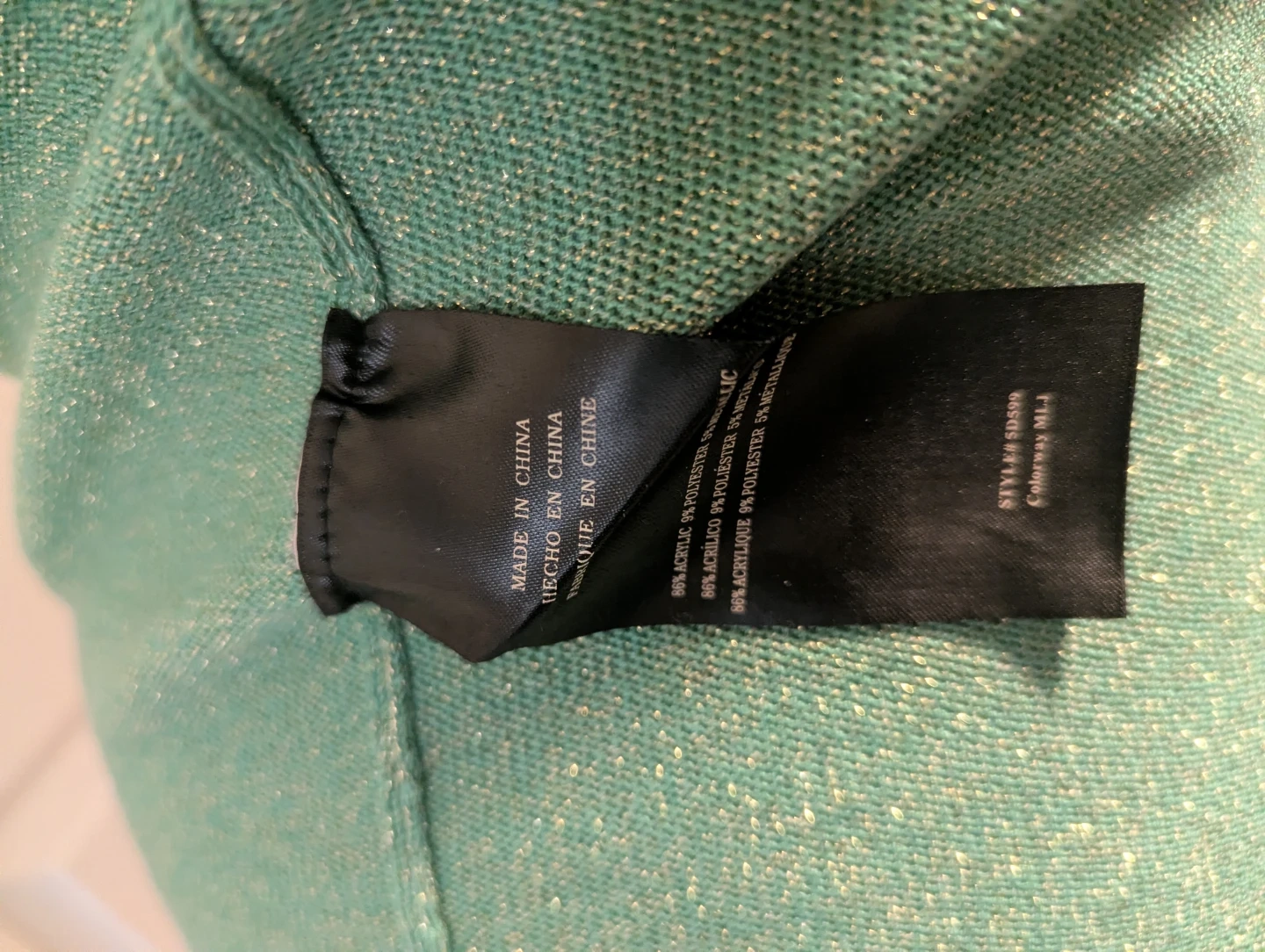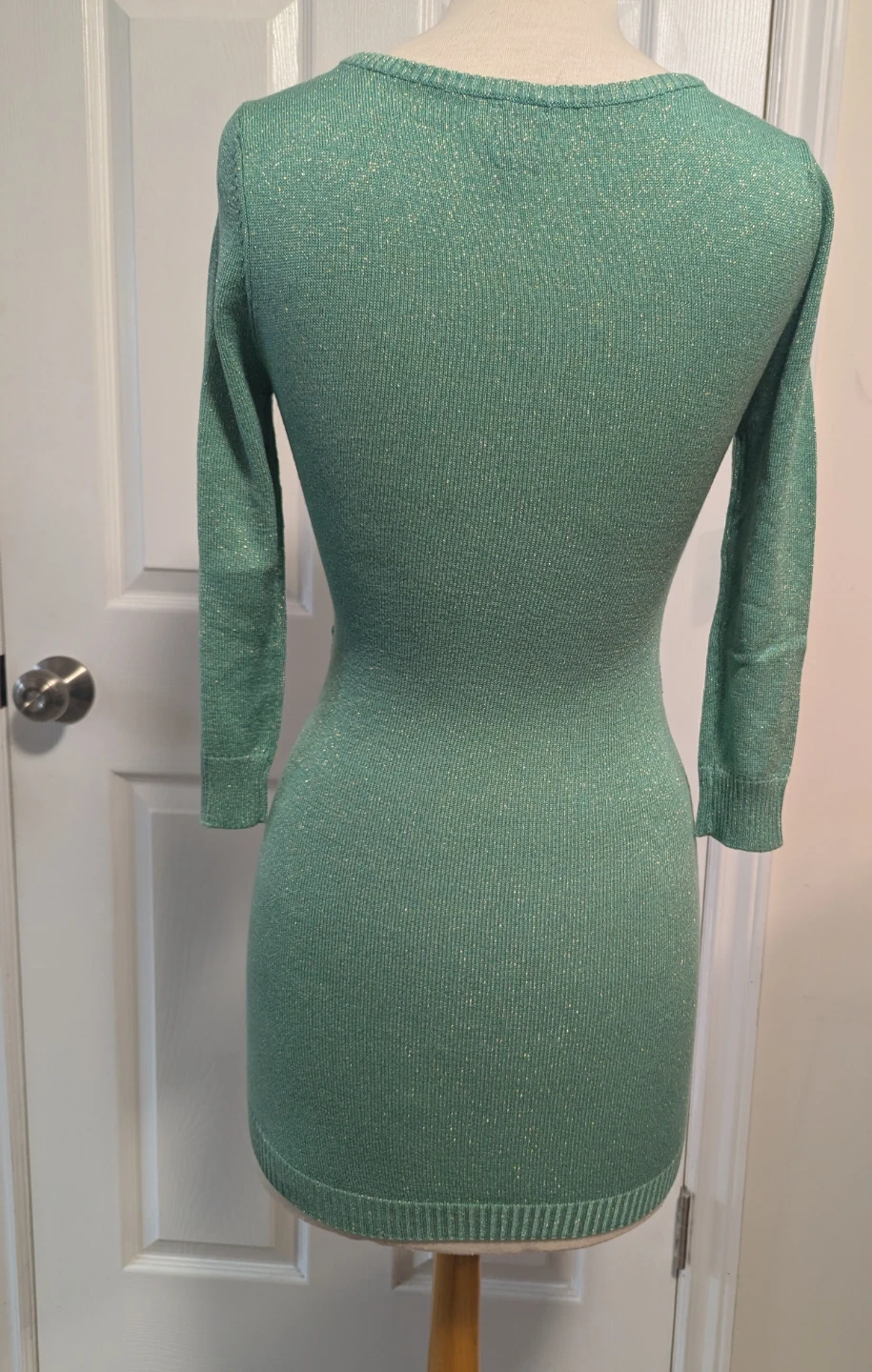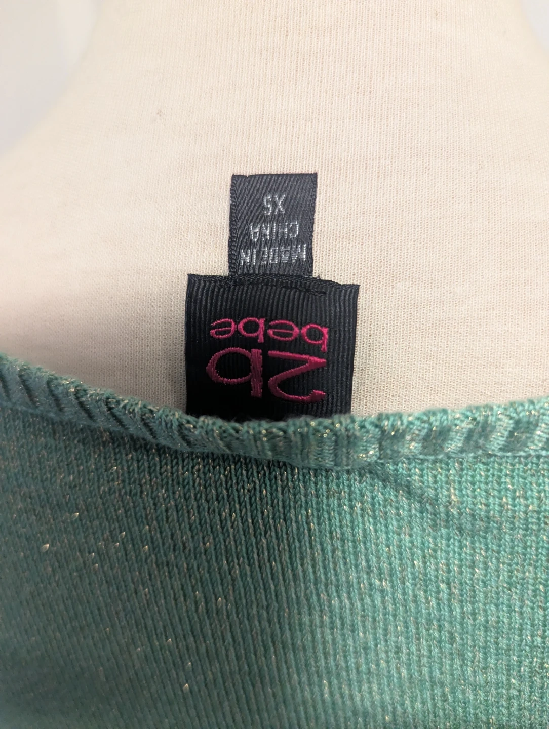 This is a women's metallic green knit sweater from Bebe. It's a size XS. The material is 88% acrylic, 9% polyester, and 3% metallic.