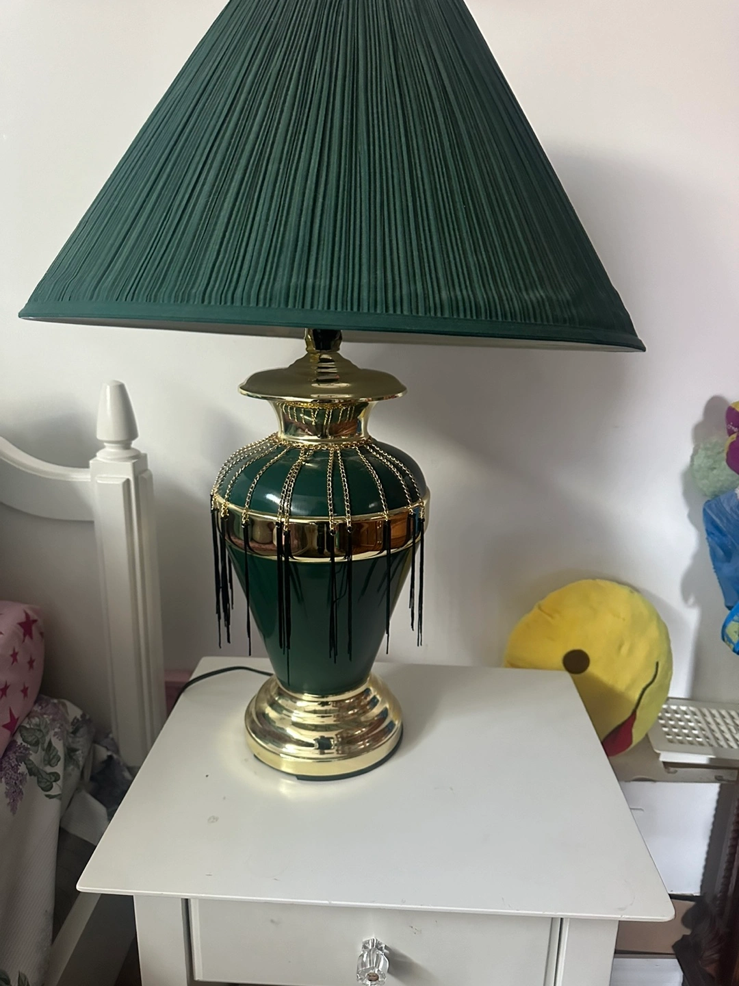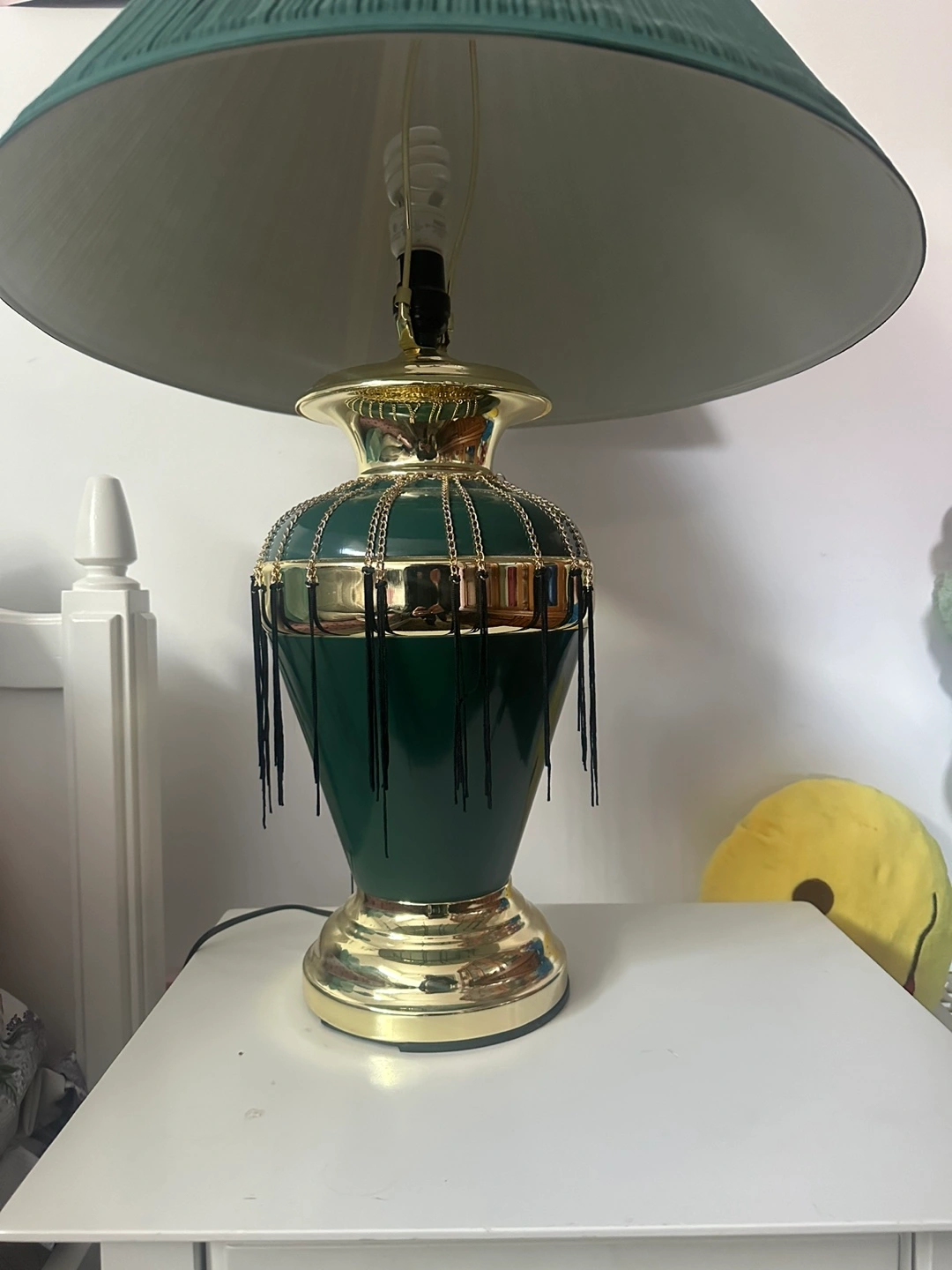 Dark green table lamp gold base and accents. Unique fringed detail around the midsection. Features a dark green pleated lampshade. Pre-owned, shows minor wear.