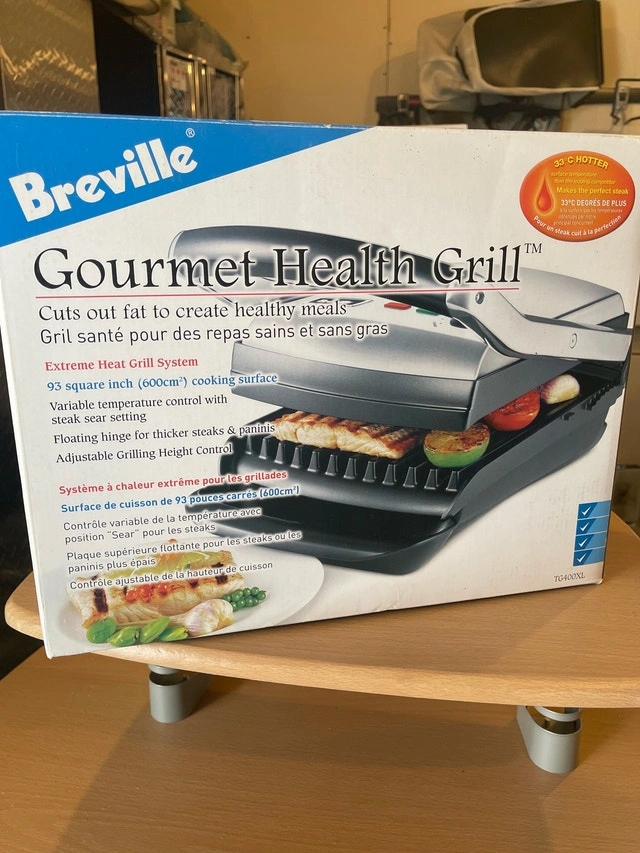 Selling a Breville Gourmet Health Grill that cuts out fat to create healthy meals. It features a 93 square inch cooking surface and variable temperature control with a sear setting. The floating hinge accommodates thicker steaks and paninis, and the adjustable grilling height control adds versatility. Key features include: 93 sq. in. cooking surface, variable temperature with sear, floating hinge, and adjustable height. Excellent condition, hardly used. If you're reading this, the item is still available.