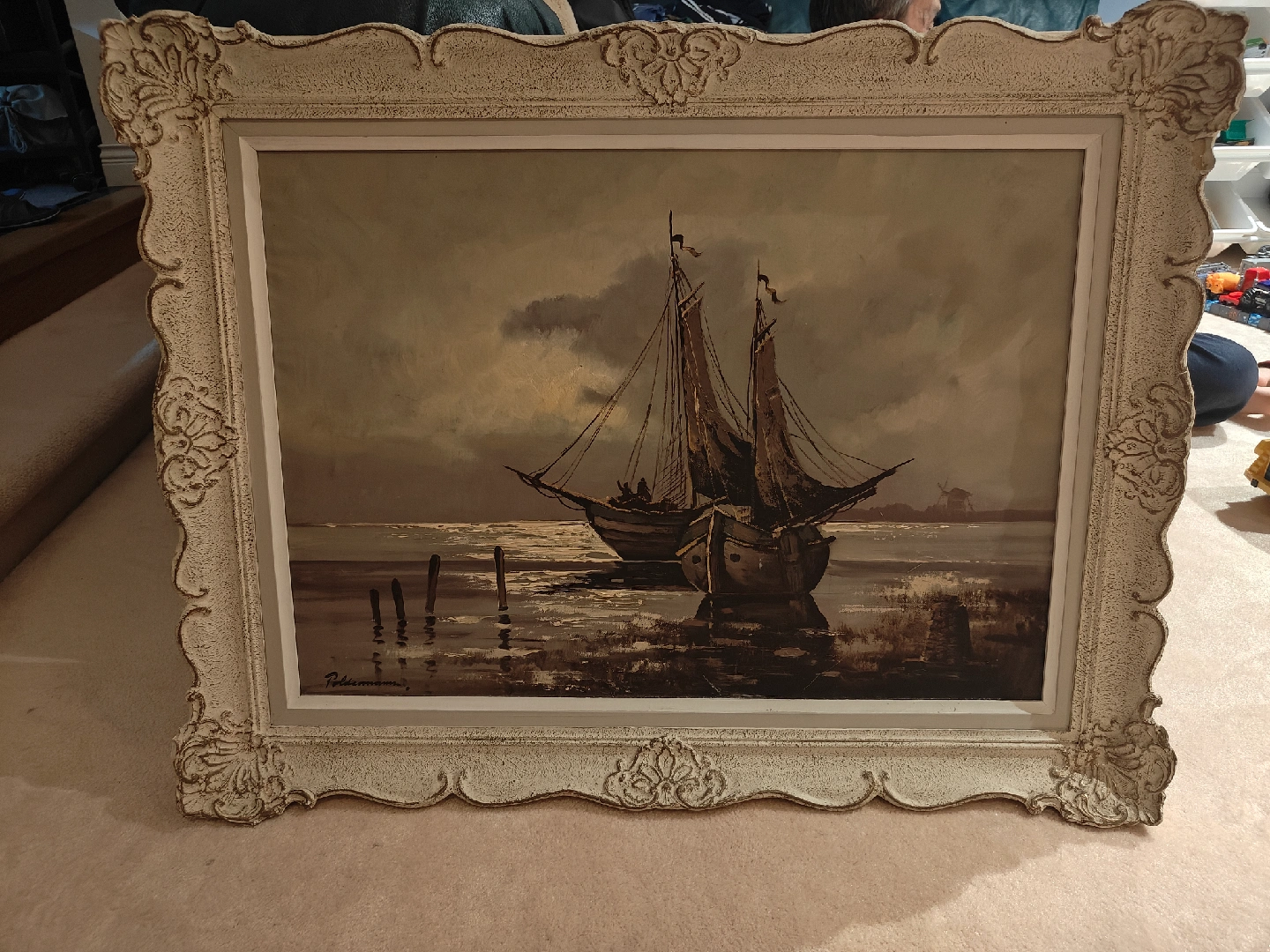 Selling a vintage framed oil painting. The painting features a seascape with sailboats and a windmill in the background. It's signed "Poldermans" in the lower left corner. The frame is ornate and adds to the painting's vintage charm