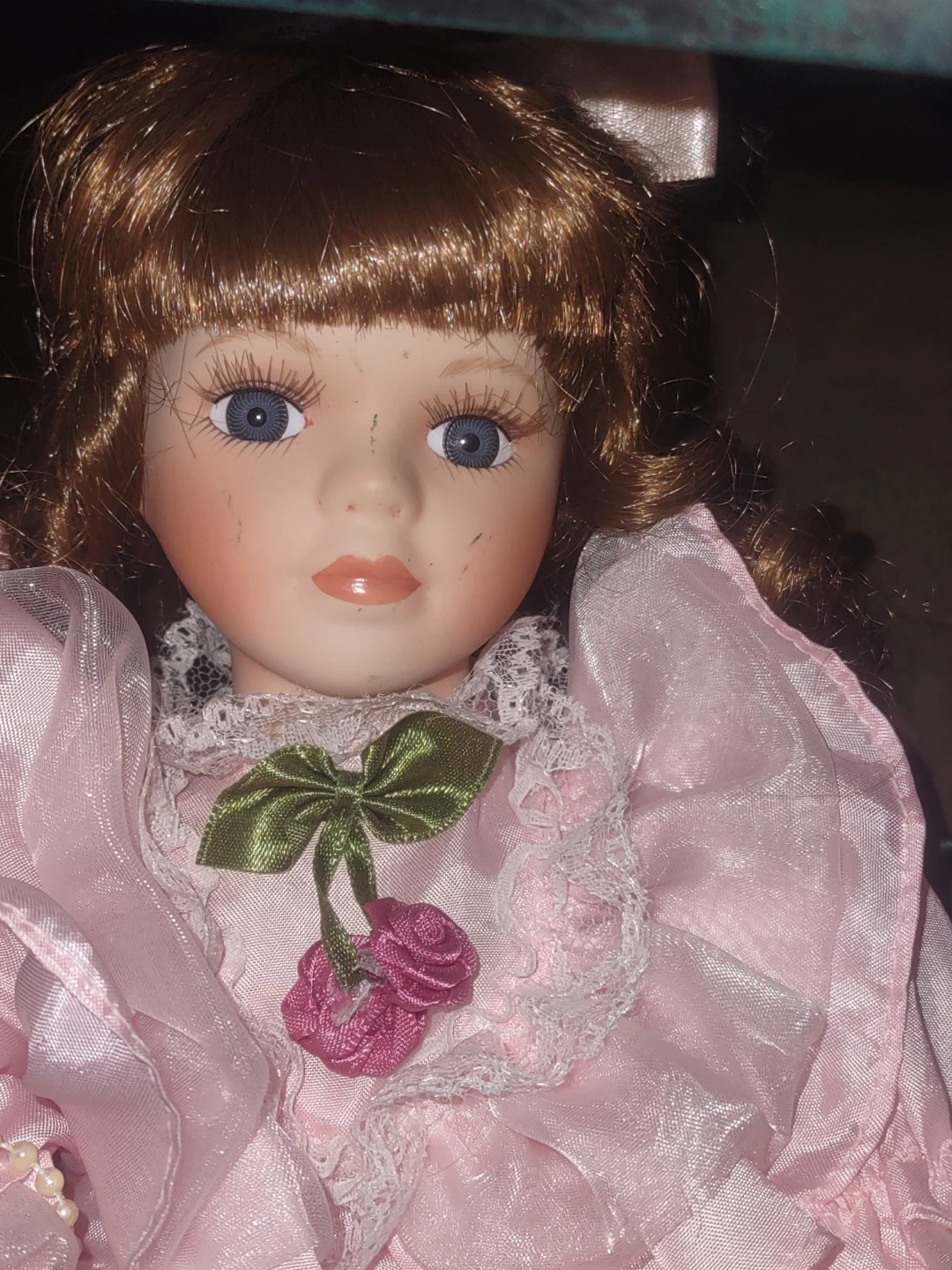 This is a lovely porcelain doll dressed in an ornate pink satin gown with lace trim. She's accessorized with a pearl necklace and a heart-shaped purse. It's a charming decorative piece!