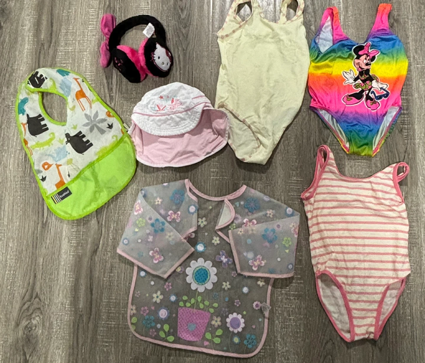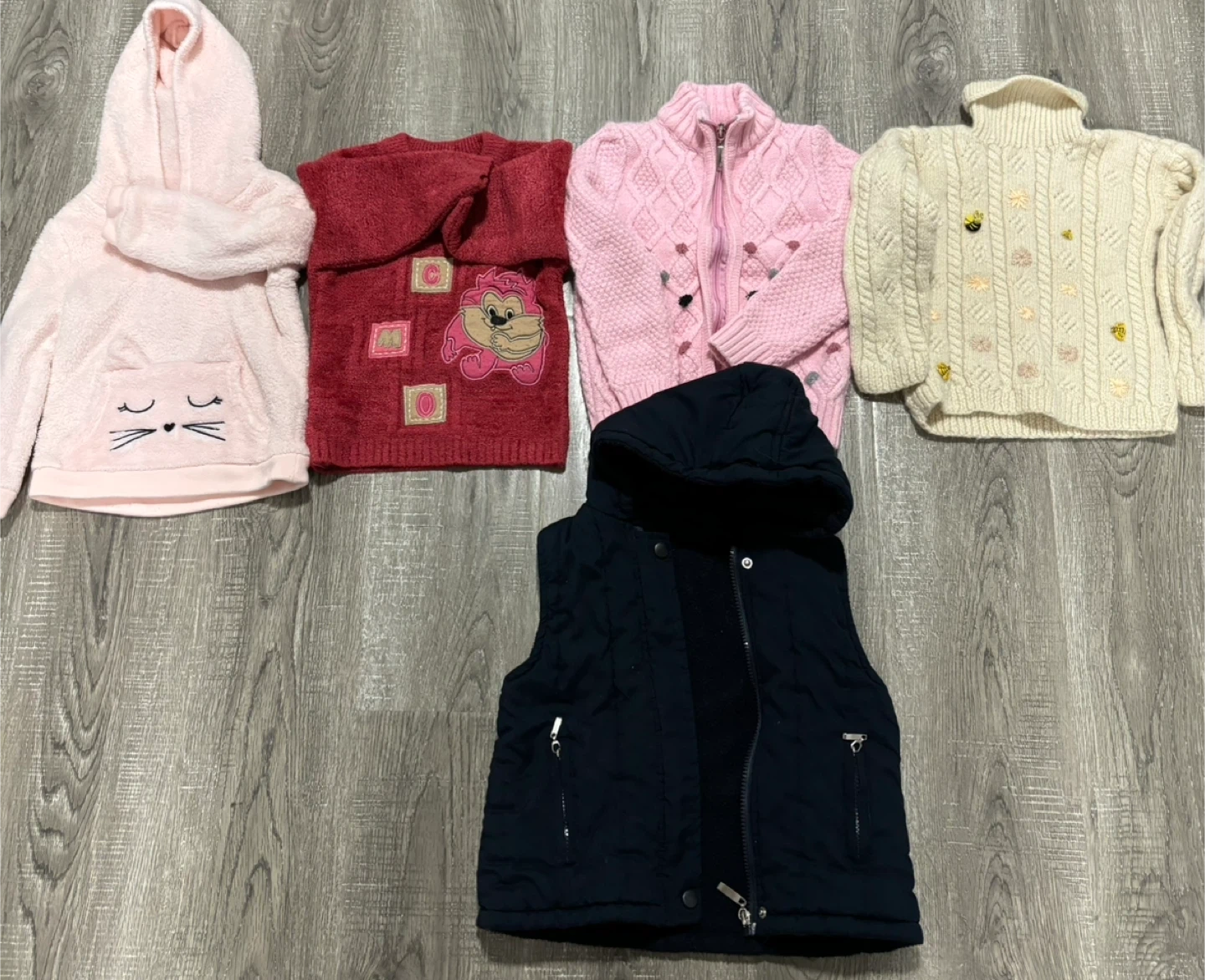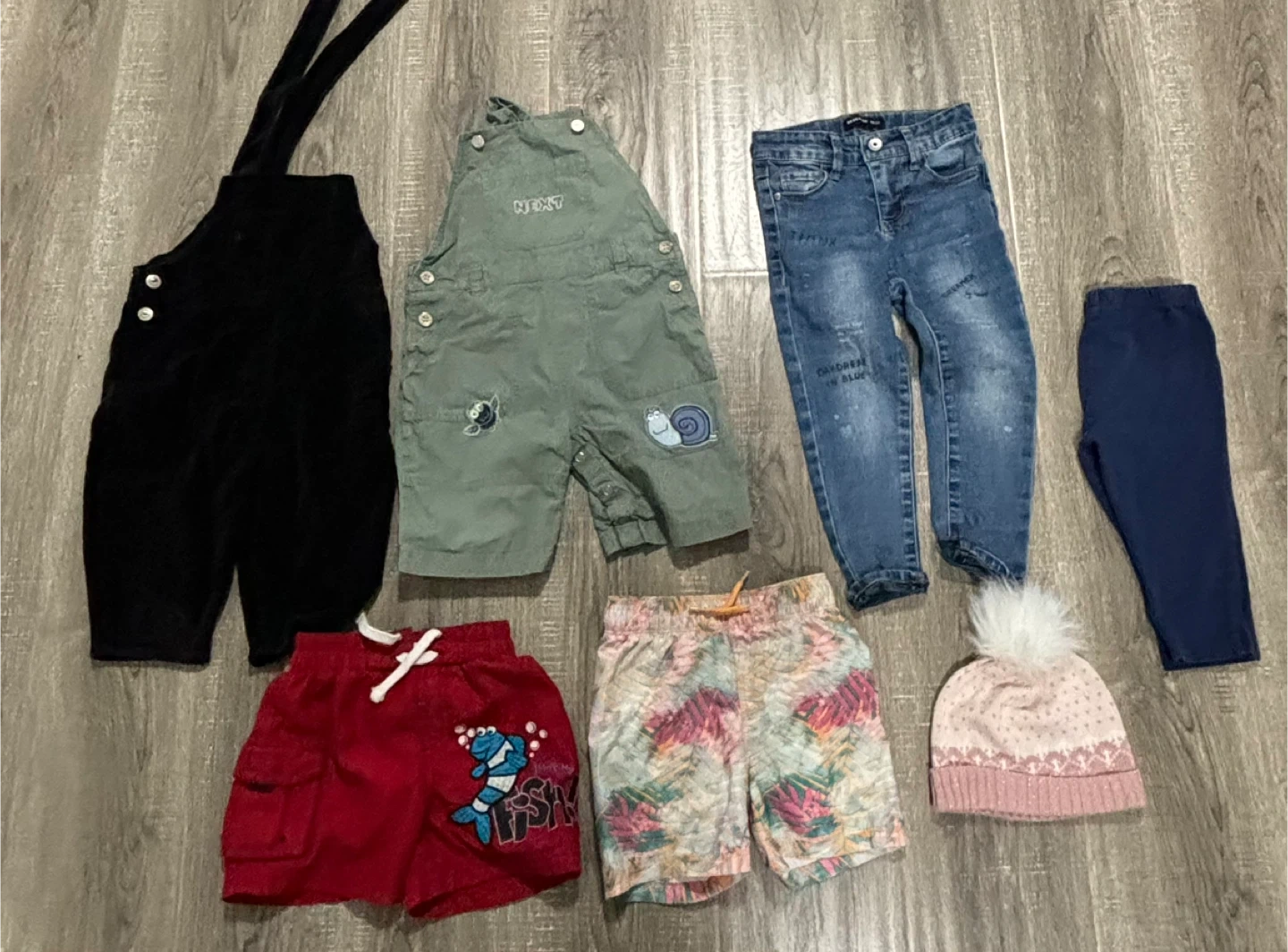 A big bundle of mixed baby and toddler clothing items! There's a variety of items, including dresses, tops, bottoms, outerwear, and accessories, perfect for building a little one's wardrobe