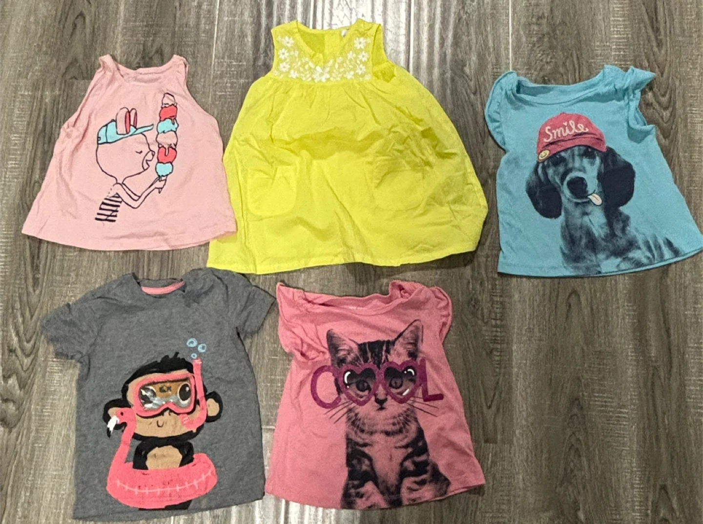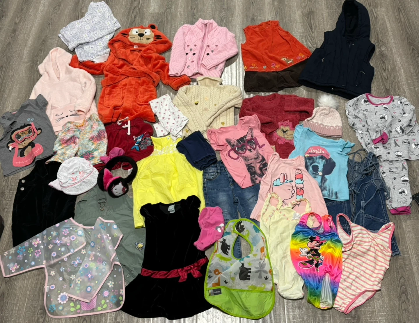 A big bundle of mixed baby and toddler clothing items! There's a variety of items, including dresses, tops, bottoms, outerwear, and accessories, perfect for building a little one's wardrobe