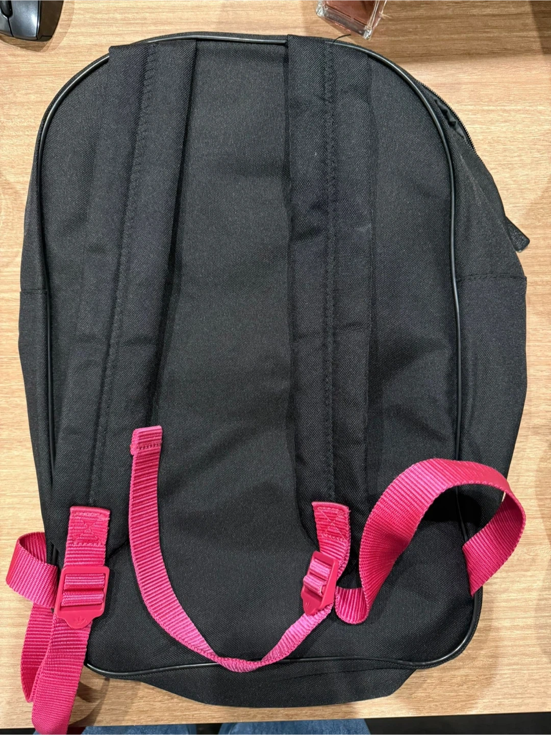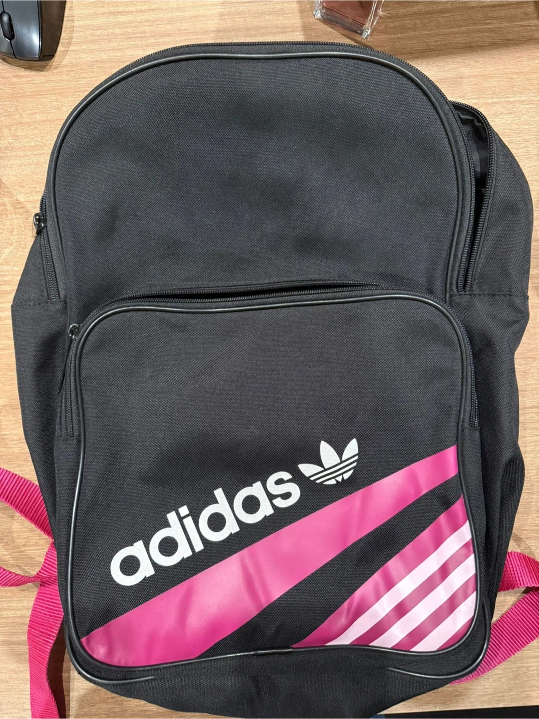 This is an Adidas backpack. It's black with pink accents and straps. The main compartment and front pocket are zippered.