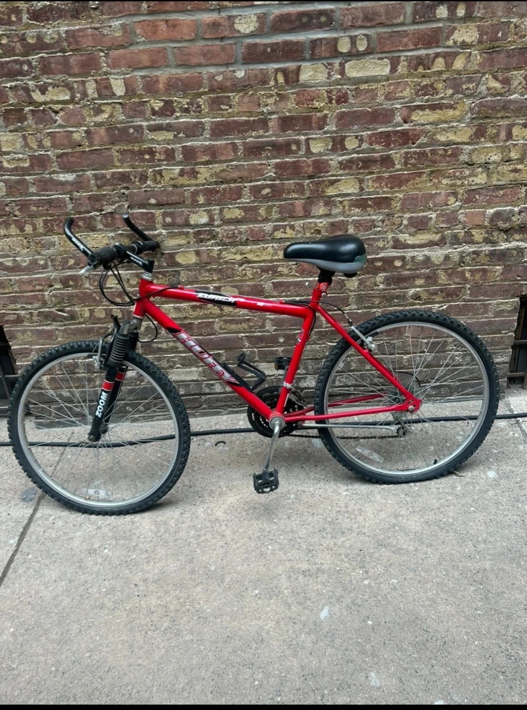 Selling a red Huffy Omega bike! It's ready for a new owner. The bike has a black seat and is in good condition for riding around town