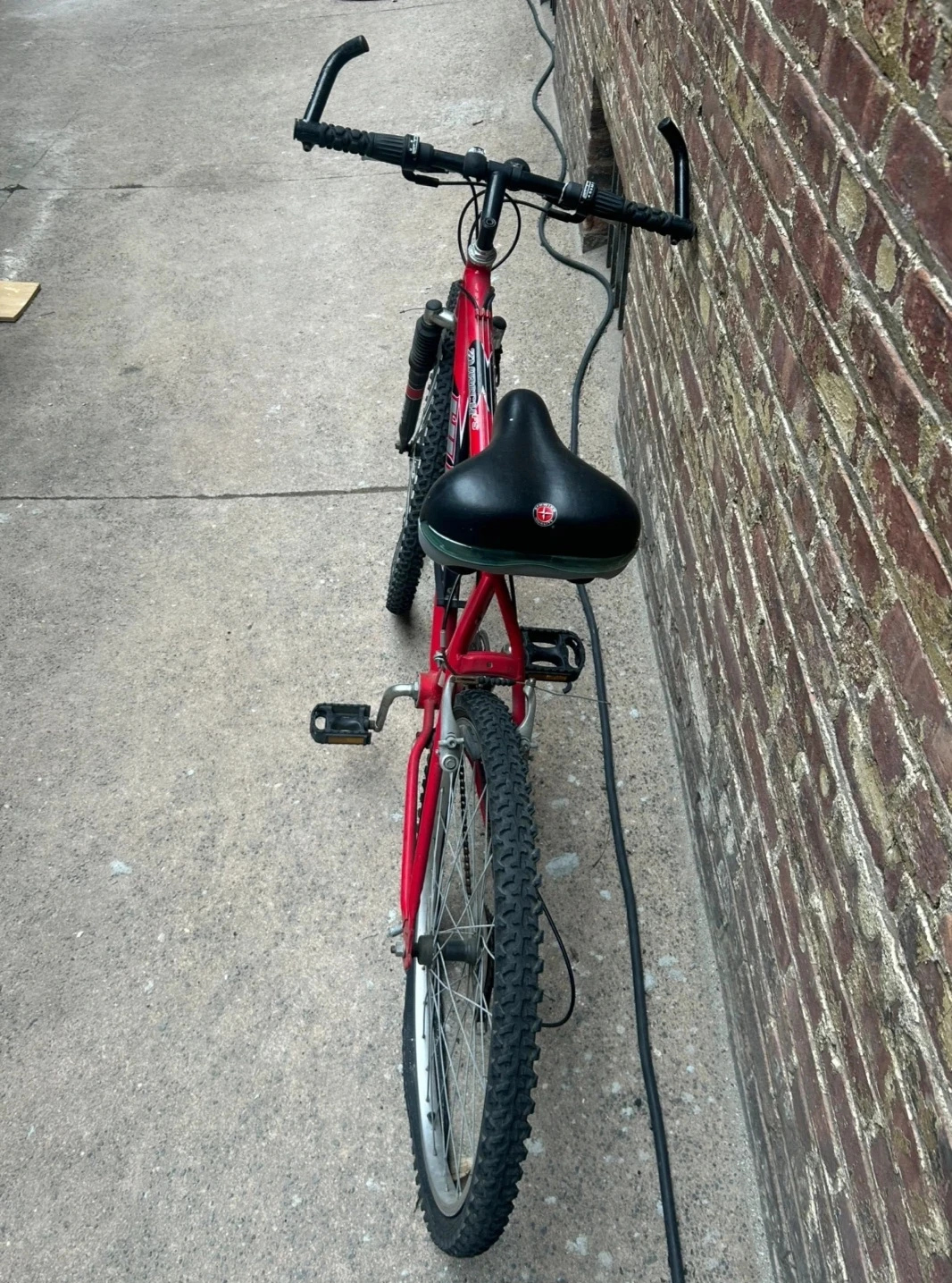 Selling a red Huffy Omega bike! It's ready for a new owner. The bike has a black seat and is in good condition for riding around town