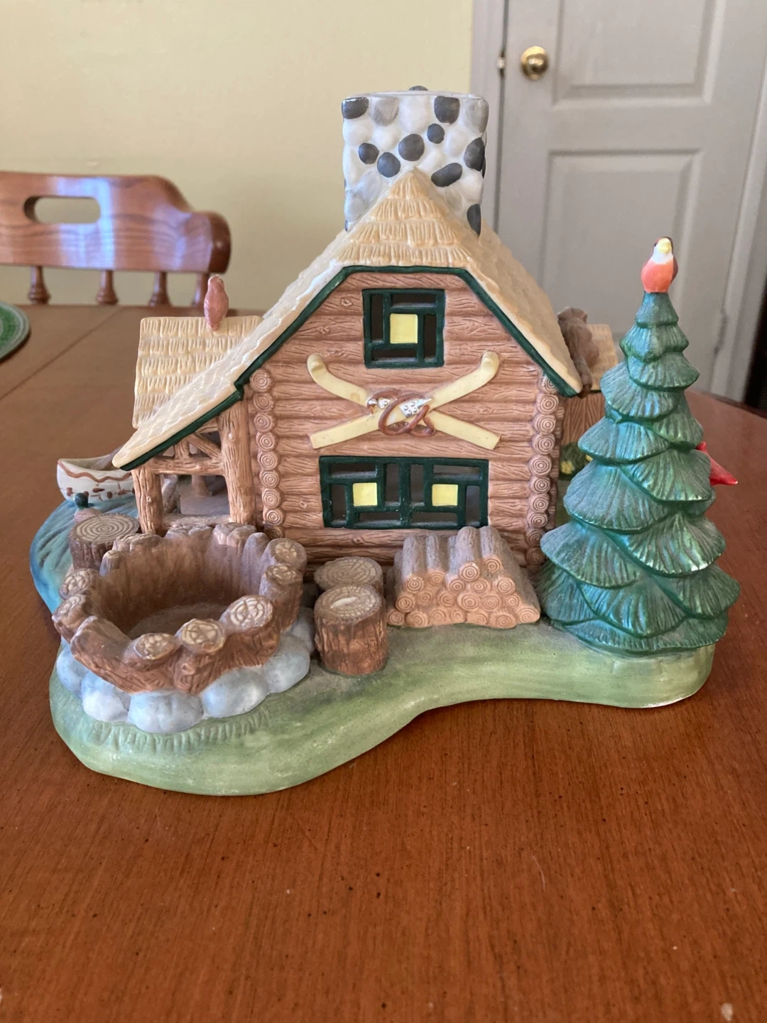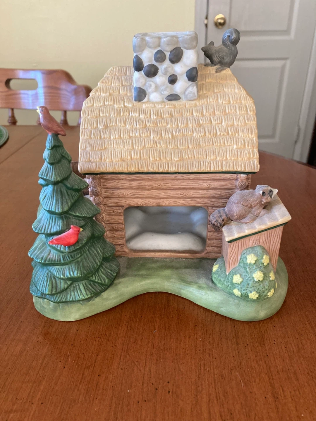 This Vintage Partylite Retired charming ceramic “Gone Fishing” scene features a cozy log cabin with a ski motif and woodland animals. It's a lovely piece for decor display. The scene includes a campfire pit, canoe, and a detailed evergreen tree with birds.