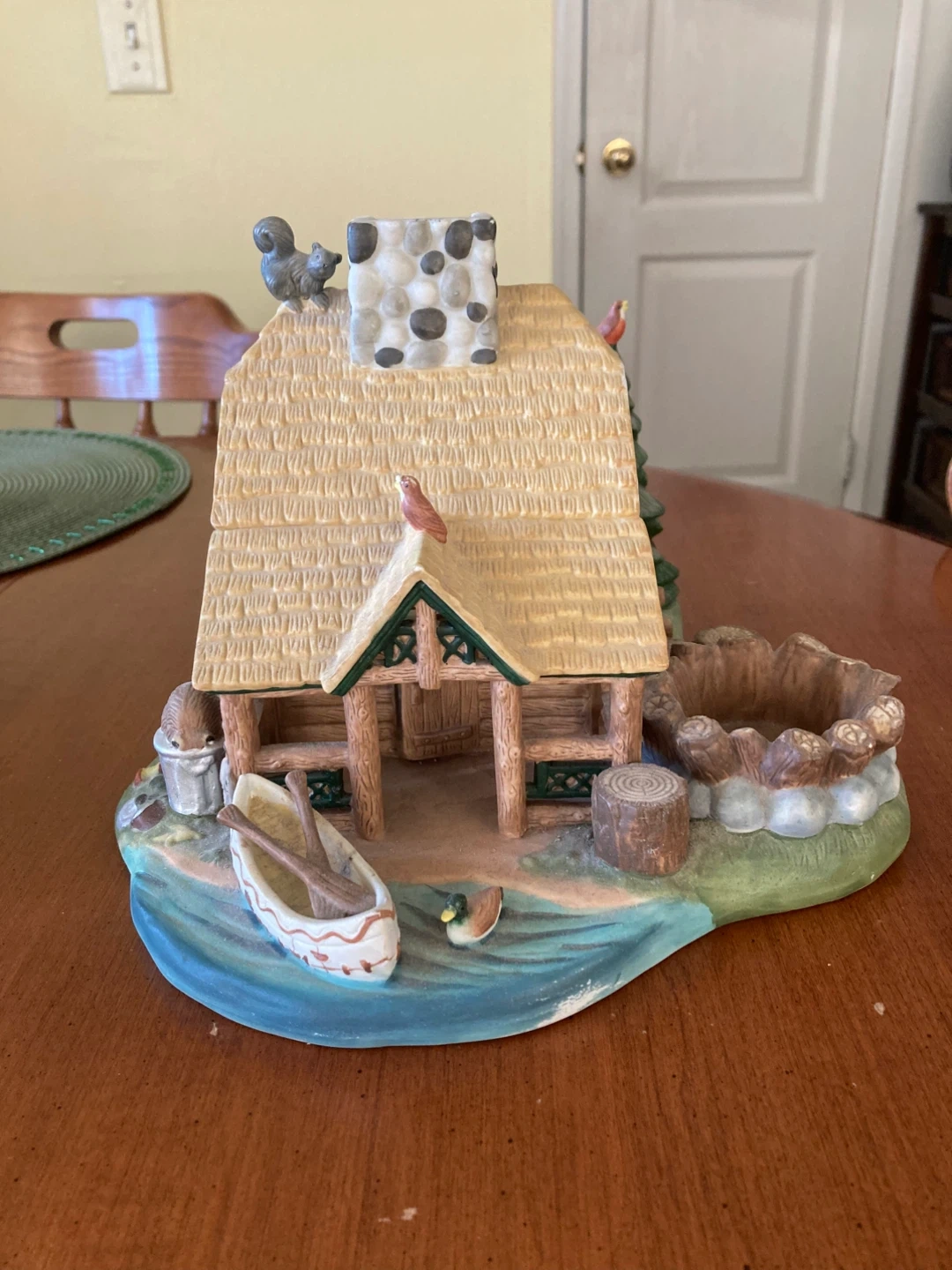 This Vintage Partylite Retired charming ceramic “Gone Fishing” scene features a cozy log cabin with a ski motif and woodland animals. It's a lovely piece for decor display. The scene includes a campfire pit, canoe, and a detailed evergreen tree with birds.