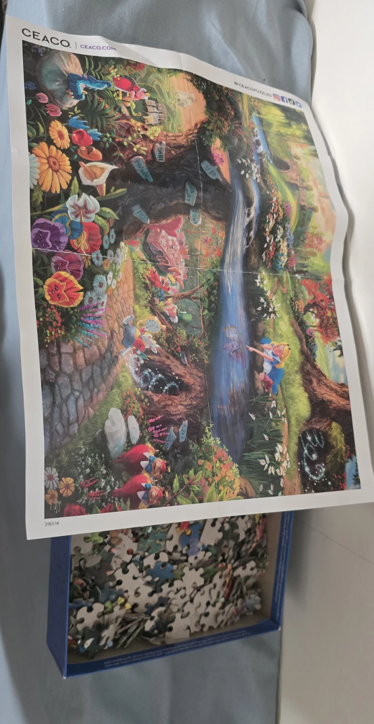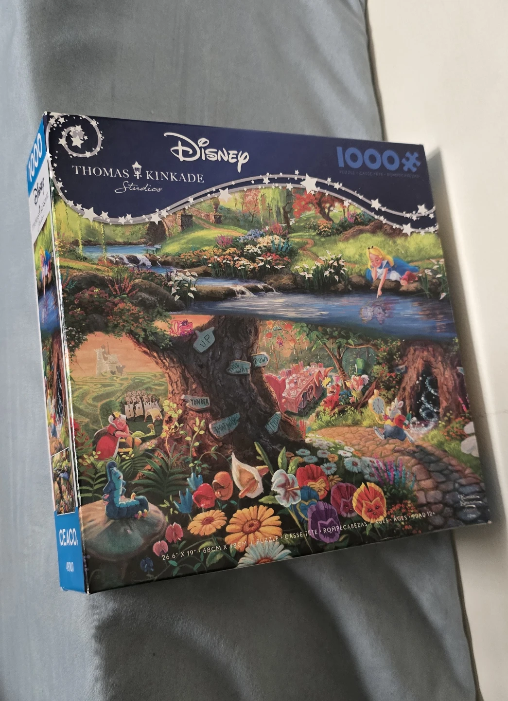 Thomas Kinkade Studios presents this stunning 1000-piece jigsaw puzzle featuring Disney's Alice in Wonderland. The completed puzzle measures 26.5" x 19". It includes all the puzzle pieces and a reference poster. This puzzle is perfect for Disney and Thomas Kinkade fans!