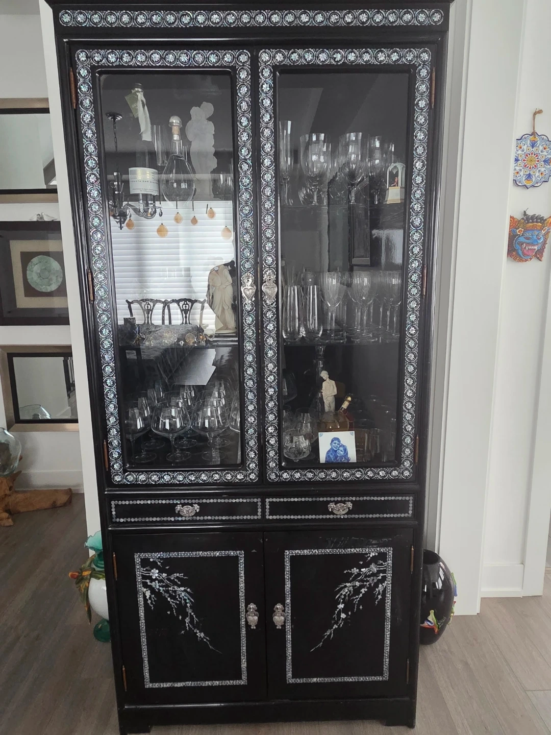 This striking black display cabinet features glass doors and beautiful decorative inlay work. It has two drawers and two lower doors for ample storage. It's a lovely piece for showcasing your glassware and decor!