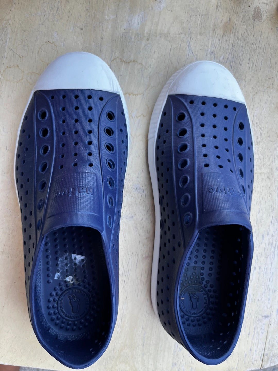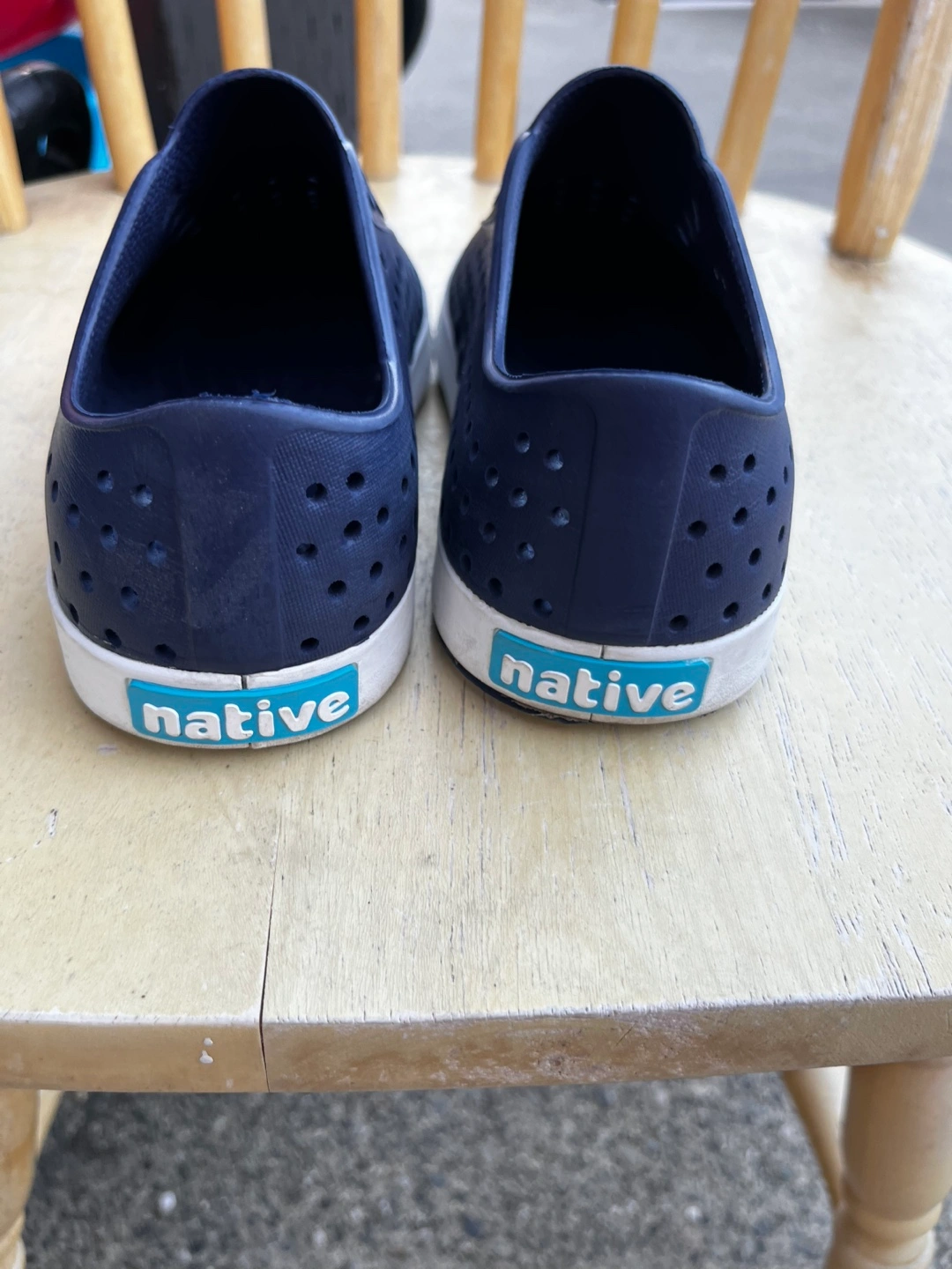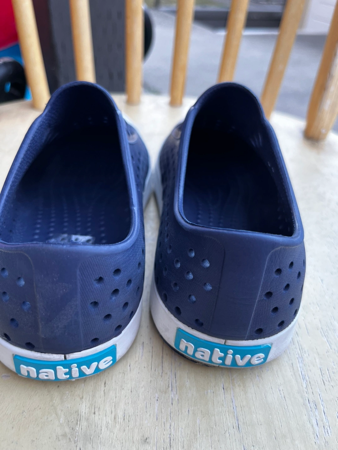 These Native slip-on shoes are in great condition! They're a cool blue colour and are a size M4/W6. Perfect for kids who love to play outside and need something easy to slip on and off.