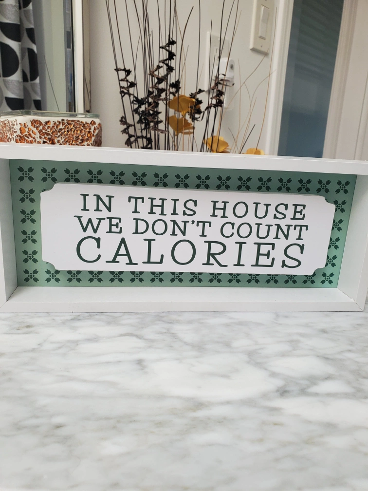 Add a touch of fun to your home with this decorative sign! It reads: "In this house we don't count calories" and is framed in white with a cute green patterned background