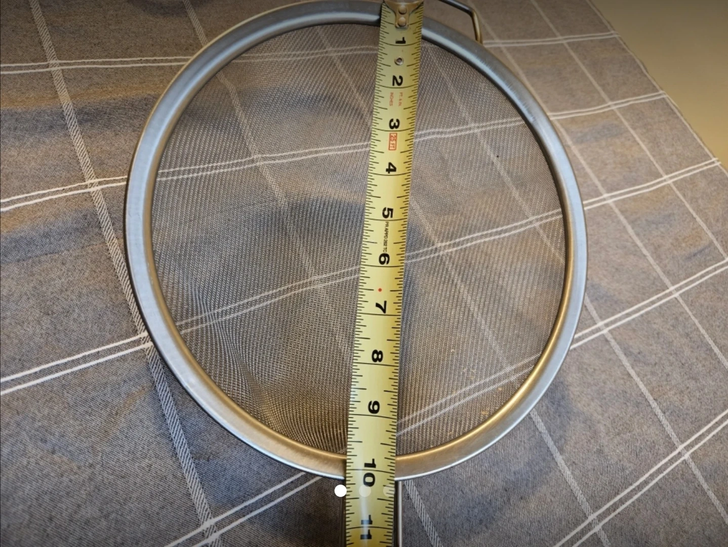 A metal mesh strainer sieve with a long handle. It measures approximately 10 inches in diameter. This sieve is useful for straining liquids or sifting dry ingredients in the kitchen.