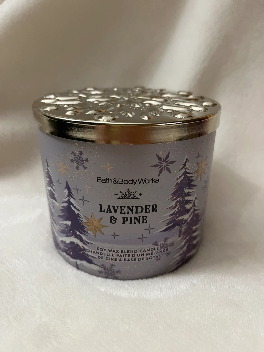 This Bath & Body Works candle features a Lavender & Pine scent. It's a soy wax blend candle with a decorative snowflake-patterned lid. Burn time is approximately 25-45 hours