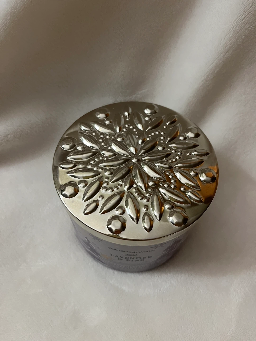This Bath & Body Works candle features a Lavender & Pine scent. It's a soy wax blend candle with a decorative snowflake-patterned lid. Burn time is approximately 25-45 hours