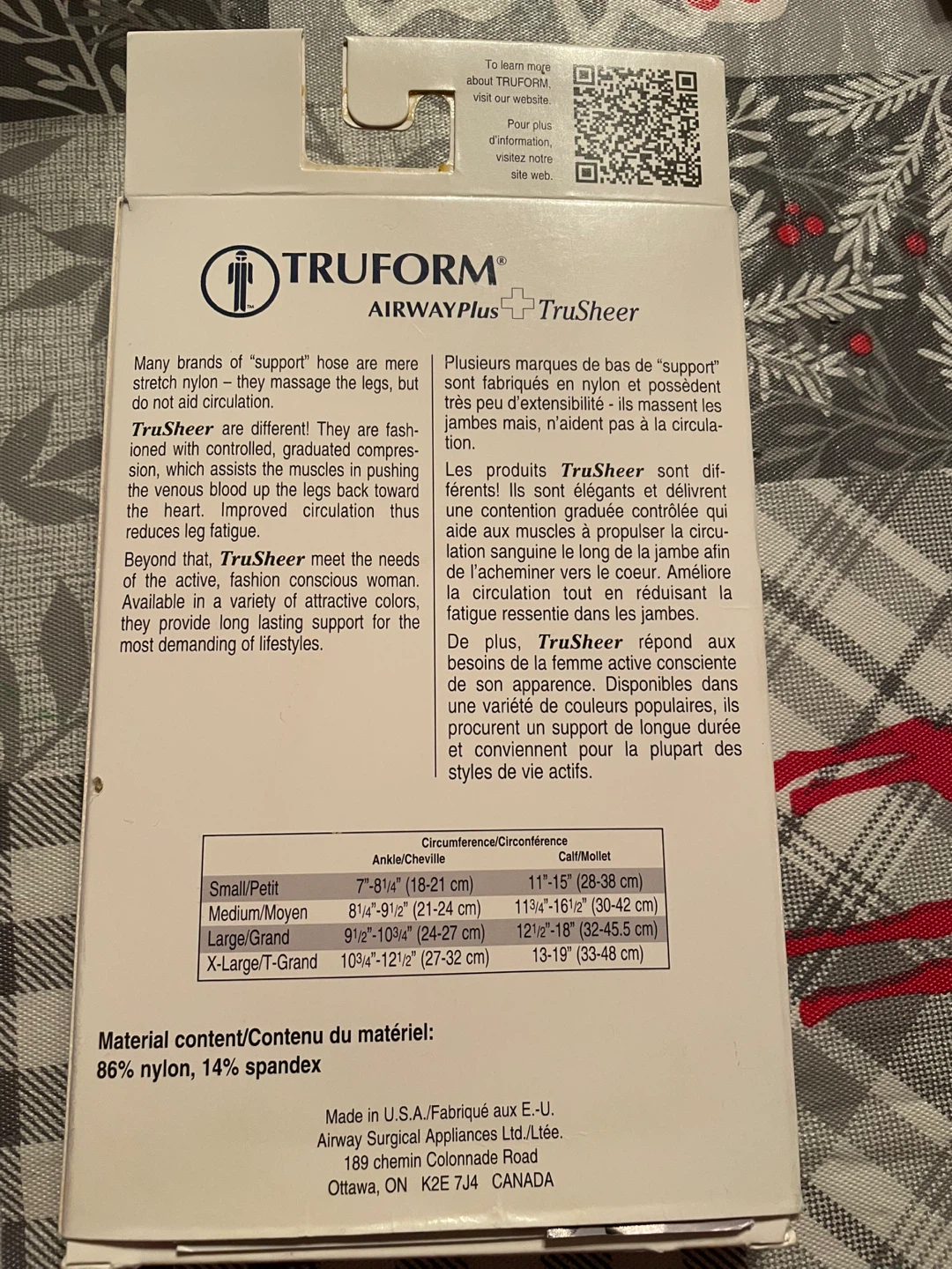 Selling Brand New in Box pairs of Truform Airway Plus TruSheer graduated compression stockings in black, size S/P. These are knee-length and provide 20-30 mmHg of compression. The stockings are made of 86% nylon and 14% spandex, and are closed toe. They are designed to improve circulation and reduce leg fatigue.