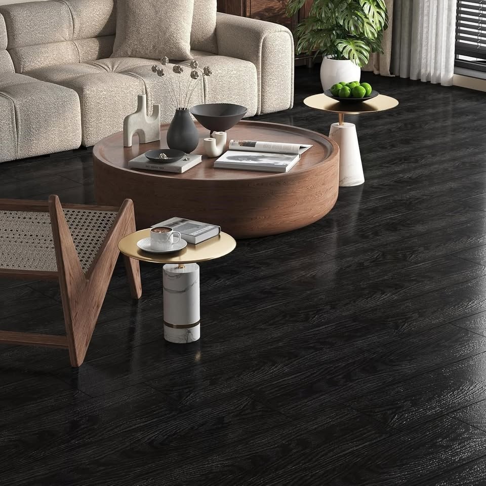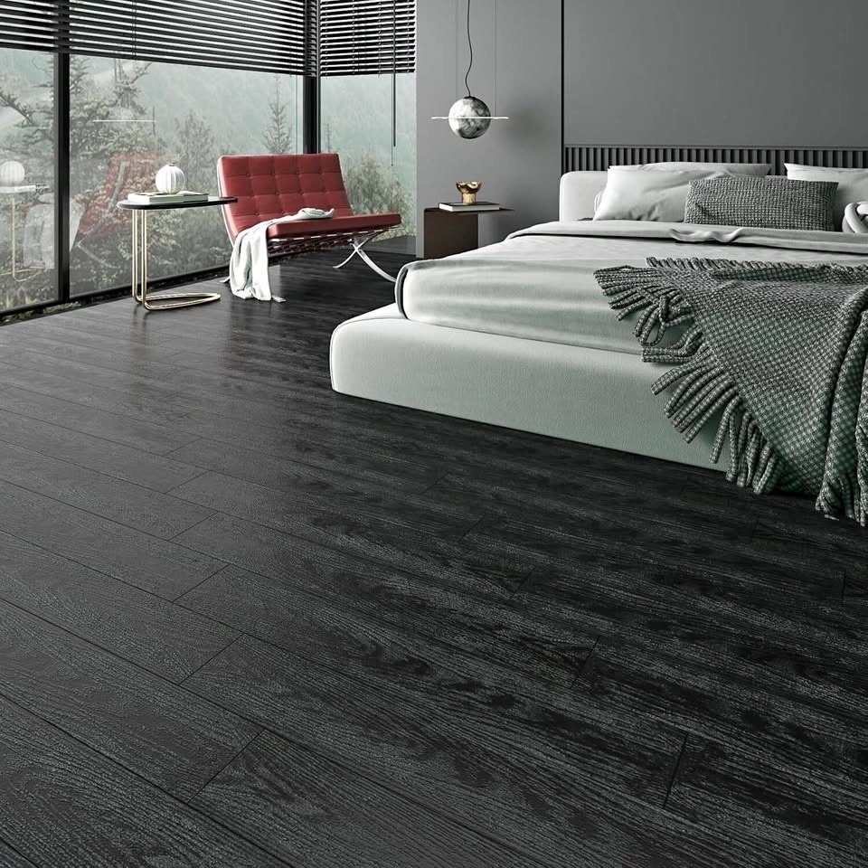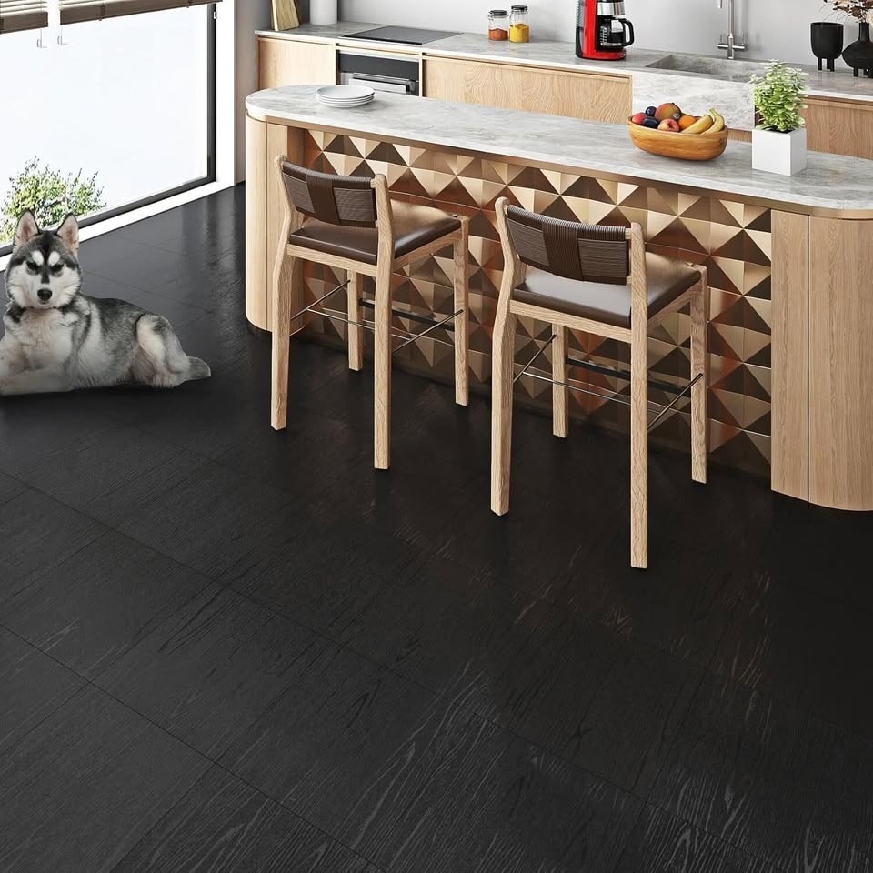Thick peel and stick floor tile: Thickness is 0.06inch (1.5mm). Size 6 X 36 inch included 18-Planks, made of vinyl, Black wood floor tiles peel and stick waterproof, groutable, non slip, no special tools needed. Renter friendly floor tile: The vinyl plank flooring could be pulled off when removed. Do no harm to original floors. Plus, the peel and stick flooring is cost-effective without a costly hassle. Do it yourself flooring: No grout or special tools required. All you do is peel the backing and then stick on floor, trim it by a utility knife if needed. Allows DIY ers to install on wood, concrete, vinyl, linoleum, ceramic or over existing floors. Multi-purpose: Sticky tiles for floor, stick on floor tiles for bathroom, black tiles for kitchen floor, vinyl plank flooring for basement, flooring planks for steps, black flooring for bedroom, laminate flooring for RV, vinyl flooring for camper, peel and stick flooring for garage, basement flooring over concrete, wood floors hardwood flooring. Waterproof peel and stick floor tile: Peel and stick waterproof floor tile for bathroom, kitchen, bedroom, basement, living room, laundry room, renters, rental, kids playroom, entryway, gym, dance room, kids room, kitchen, bedroom, bathroom, basement, foyers, laundry rooms, mudrooms, farmhouse.