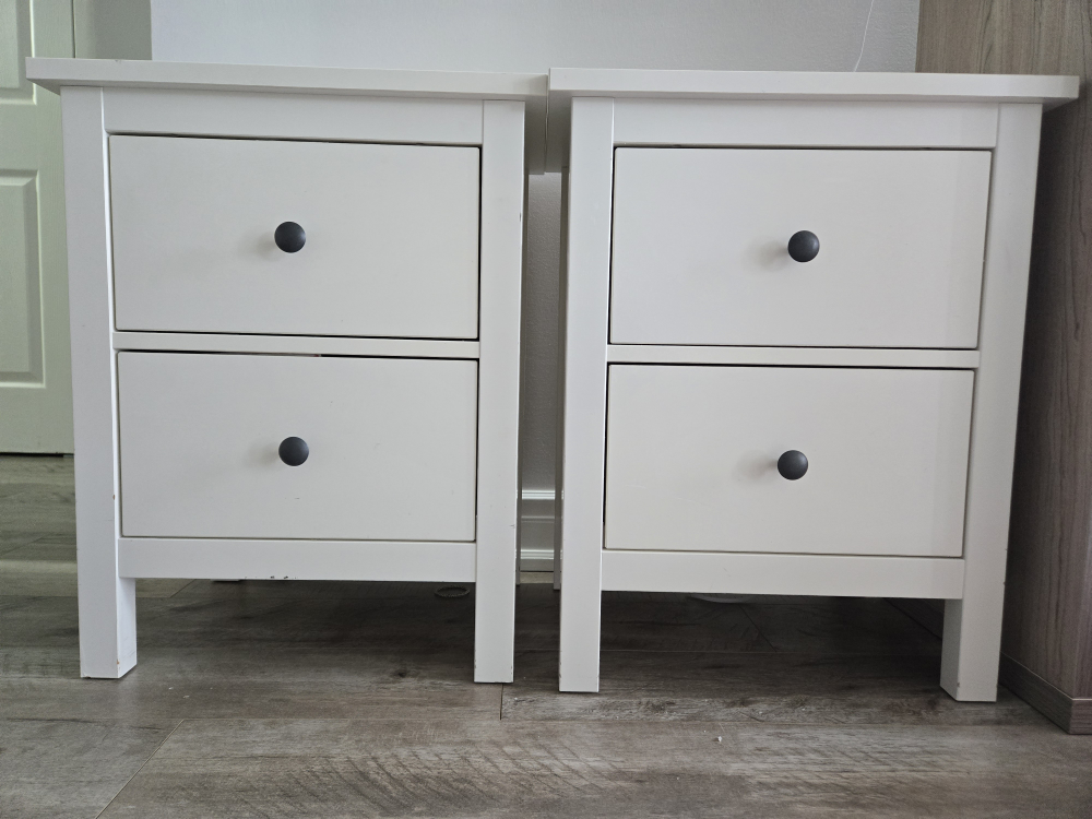 Buy & SellWhite Nightstands (Pair)White Nightstands (Pair)$40Two white nightstands, each with two drawers and black knobs. Smooth drawers. pickup, cash only. ConditionGoodWHERE TO MEETCheck LocationView MapSELLERverifiedJLThornhill N955 reviews10 chats·2 favorites·132 viewsSEND CHAT TO SELLERHi JL! I’m interested in your listing.Hi JL! I’m interested in your listing.Get the Karrot app to chatSign In to chat