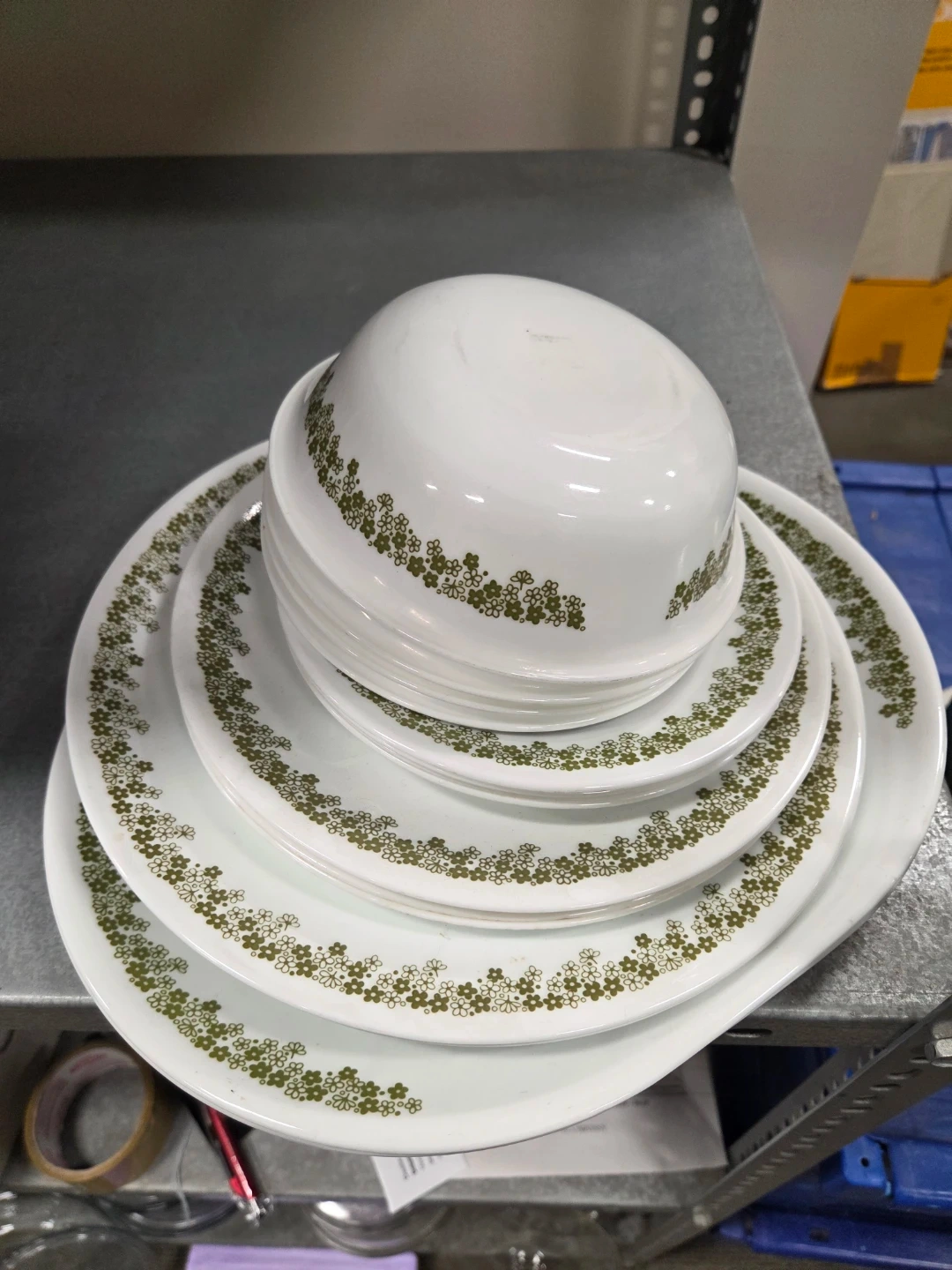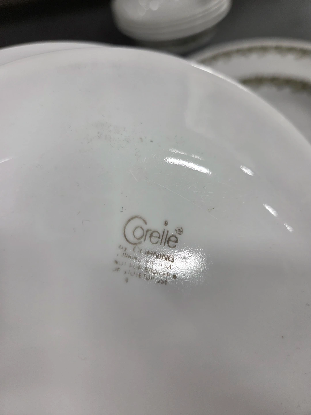 Selling a Corelle dinnerware set in the Spring Blossom pattern! This set includes plates, bowls, and serving dishes. The dishes are white with a delicate green floral design around the edges. Perfect for everyday use or special occasions!