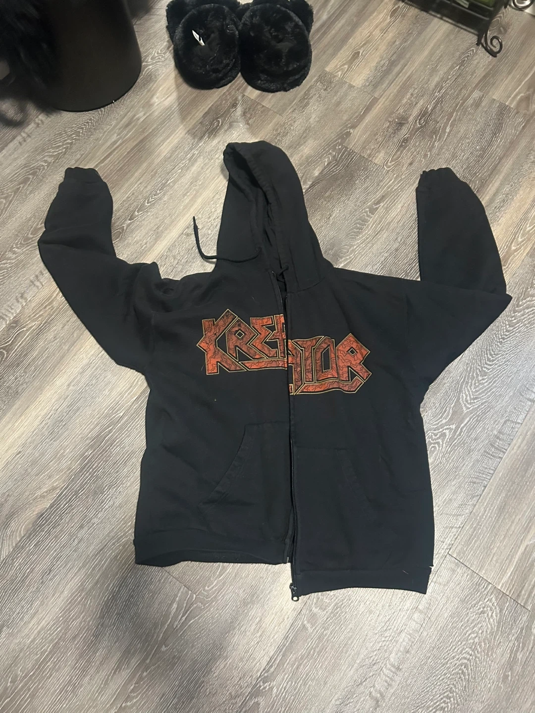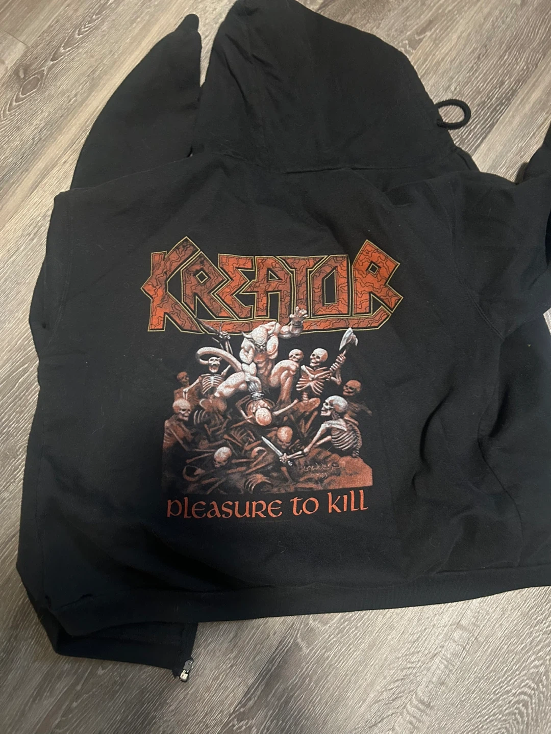 This black zip-up hoodie features the "Kreator" logo on the front and the "Pleasure to Kill" album art on the back. It's a great piece for any thrash metal fan. Cotton blend material.