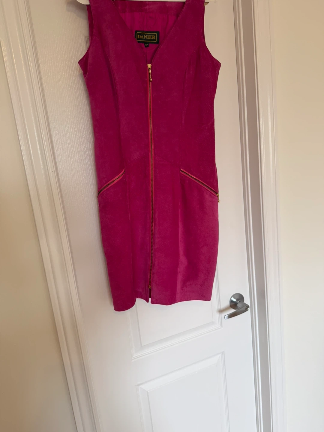 This is a Danier sleeveless dress in a bright pink hue. It features a full front zipper and two zippered pockets on the front. The material appears to be a velour or suede-like fabric. Perfect for a stylish everyday look!