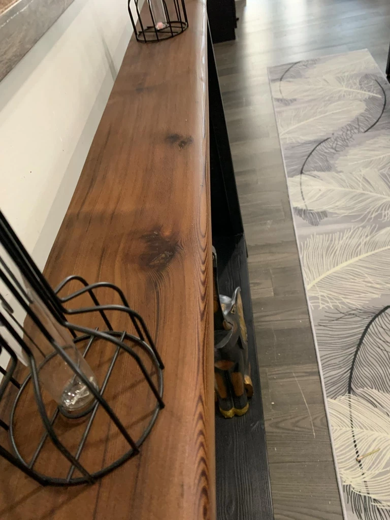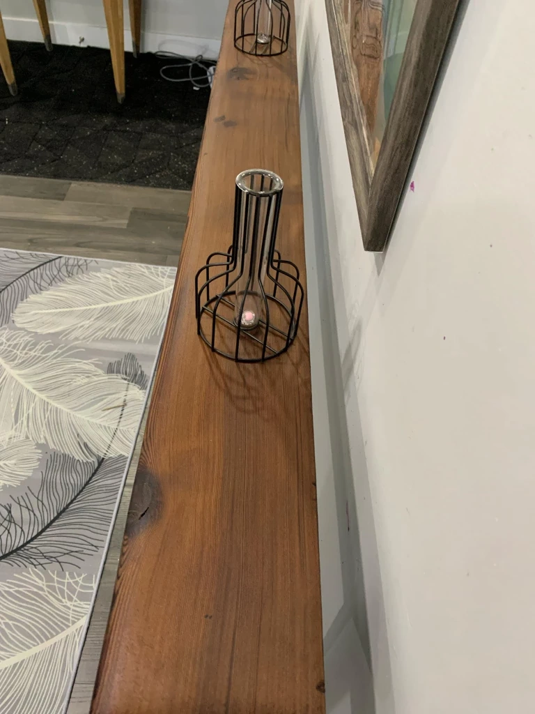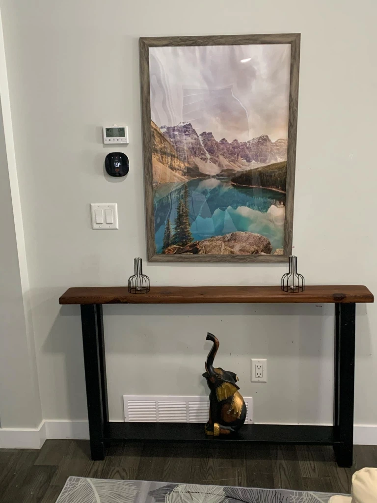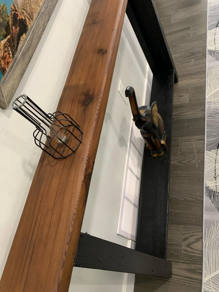 Beautiful console table. Features a rich, dark stained wood top and sleek black metal frame. Perfect entryway or living room accent piece. Adds a touch of rustic charm to any space.