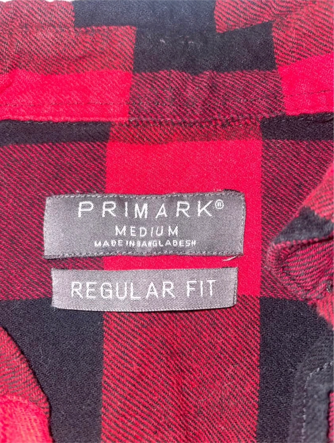 Primark flannel shirt in red and black plaid. It's a size medium with a regular fit. Made in Bangladesh. This shirt is good for casual wear.