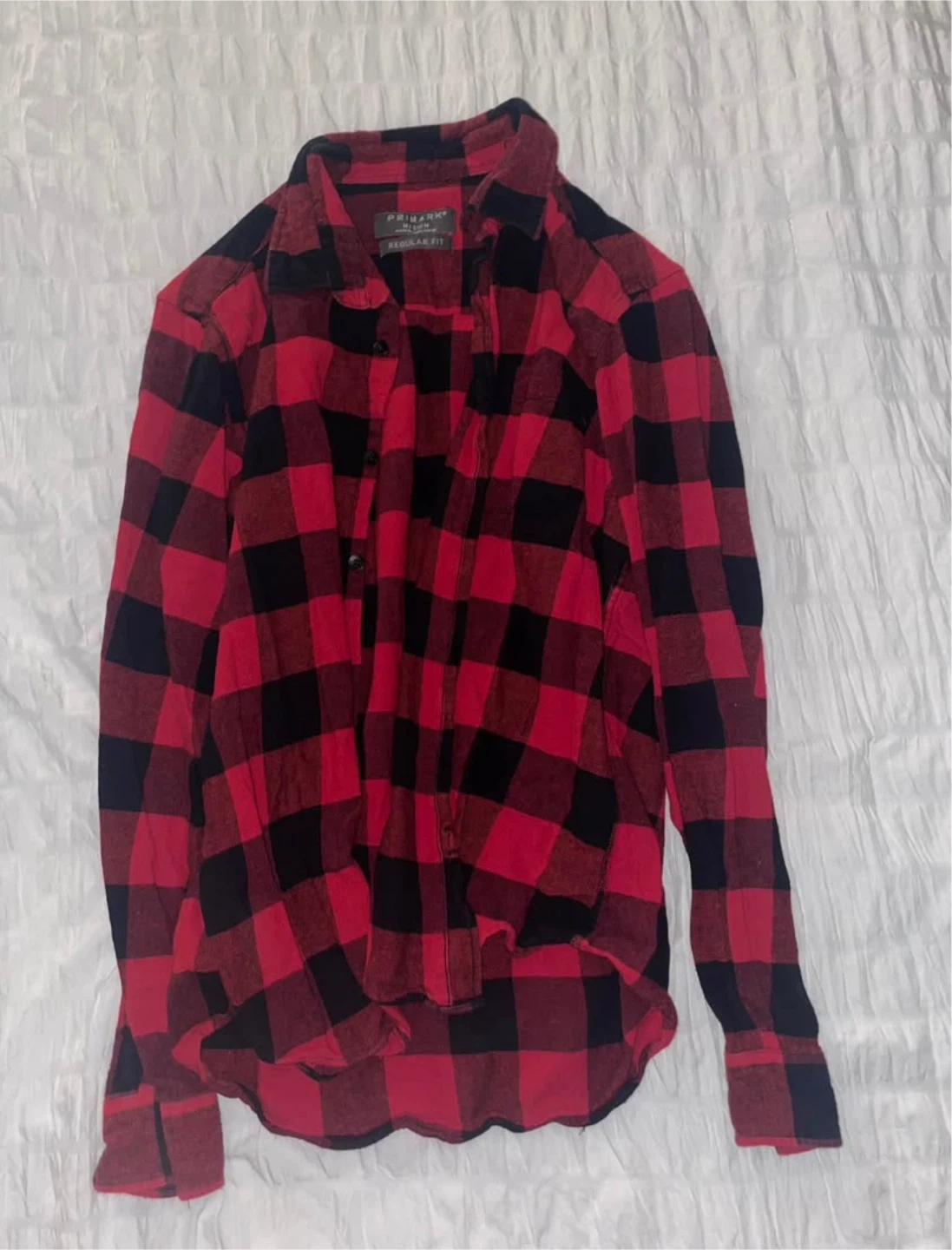 Primark flannel shirt in red and black plaid. It's a size medium with a regular fit. Made in Bangladesh. This shirt is good for casual wear.