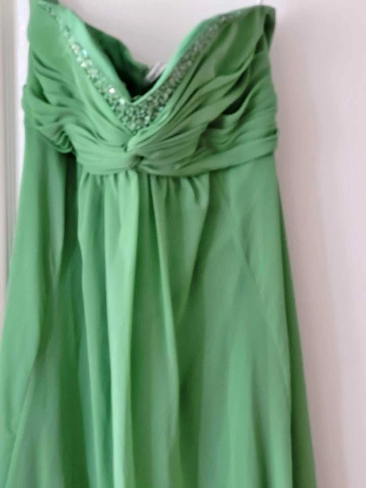 This dress is ideal for grad, prom, or a wedding. It has a very flattering fit with the top embellished with sequins and beads. This dress is sure to please!