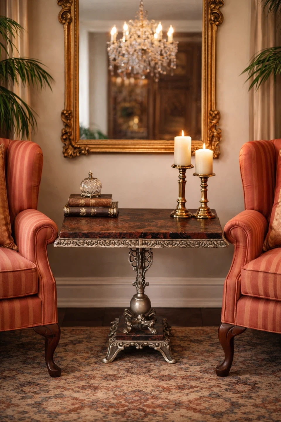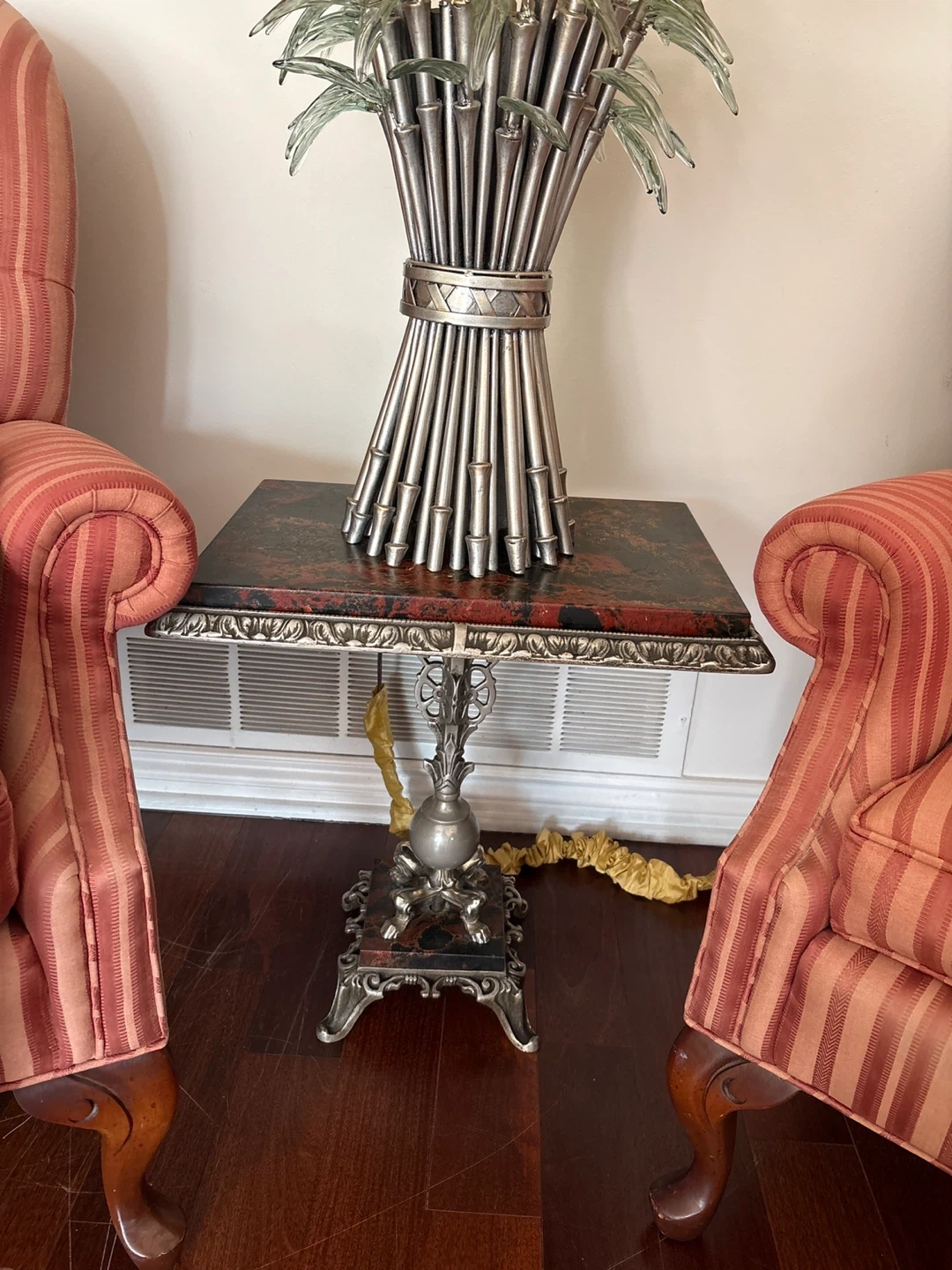 This accent table features a beautiful marble-look top and a decorative silver-toned metal base. It's designed with intricate carvings and a pedestal stand. Perfect for a hallway or living room.