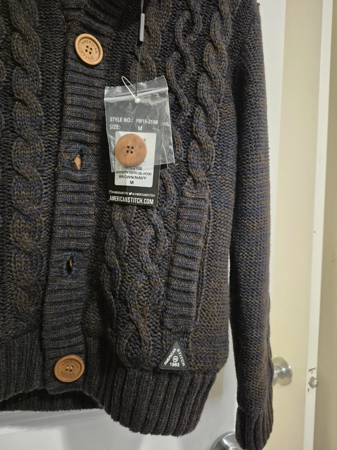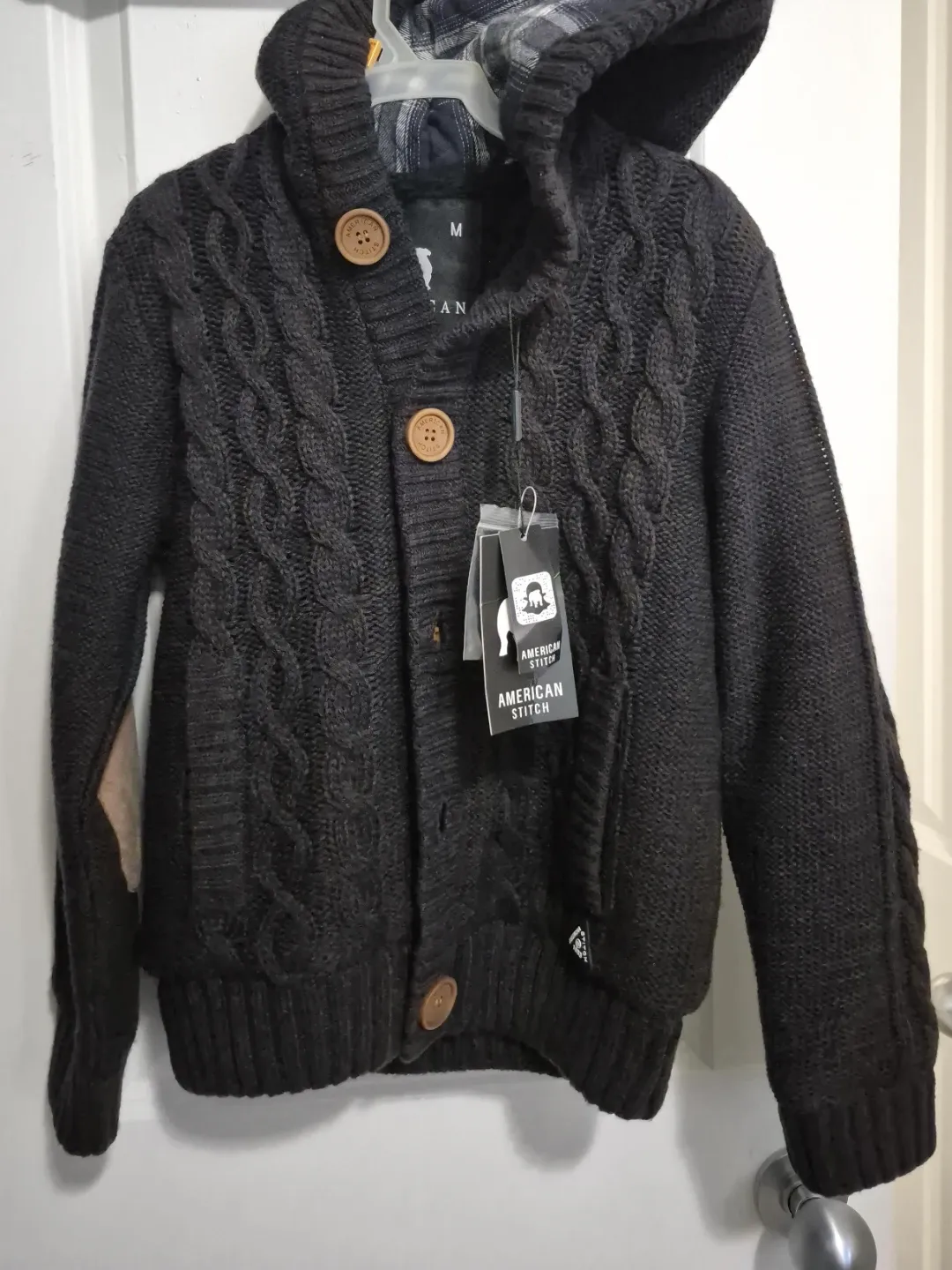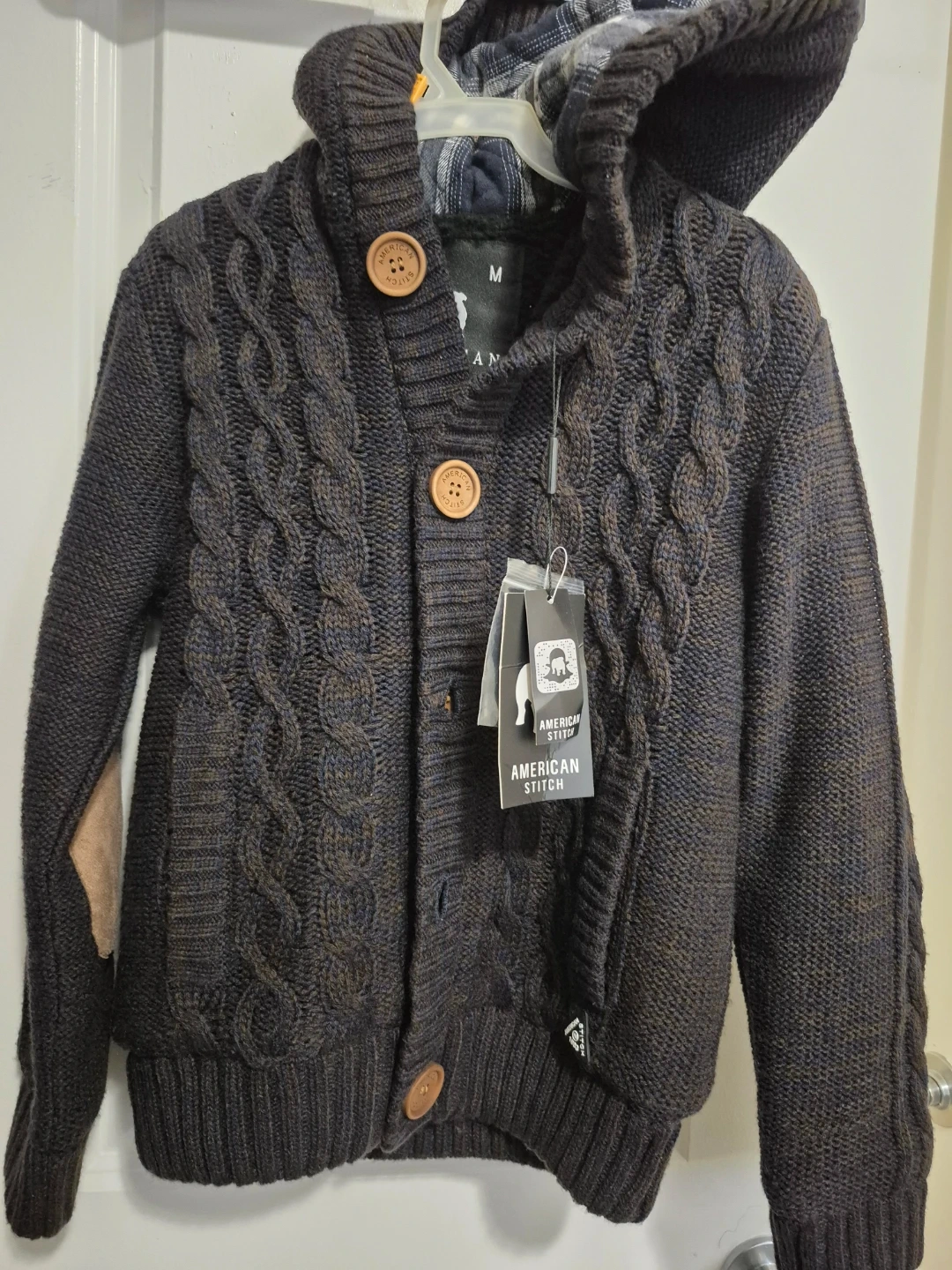 It's a dark brown, cable knit hooded cardigan from American Stitch for kid. The size is medium. It's got button closures and elbow patches. Good for the spring.