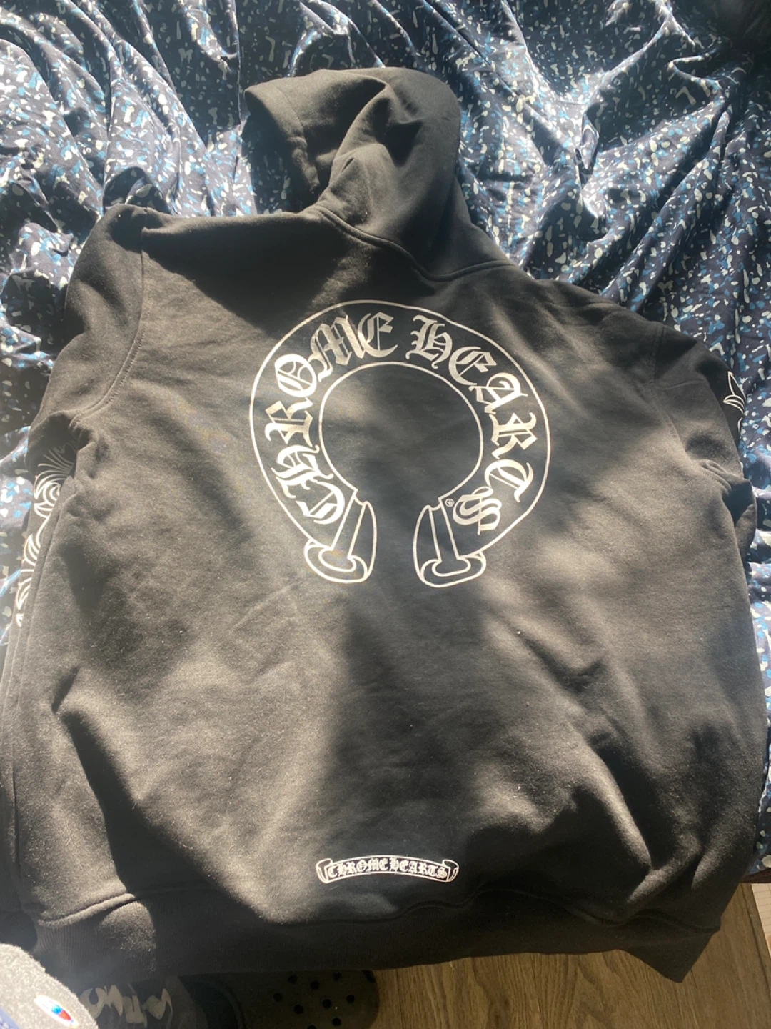 Black zip-up hoodie with Chrome Hearts logo on the back and sleeve detailing. Features a full zip closure and hood. Cotton blend material.